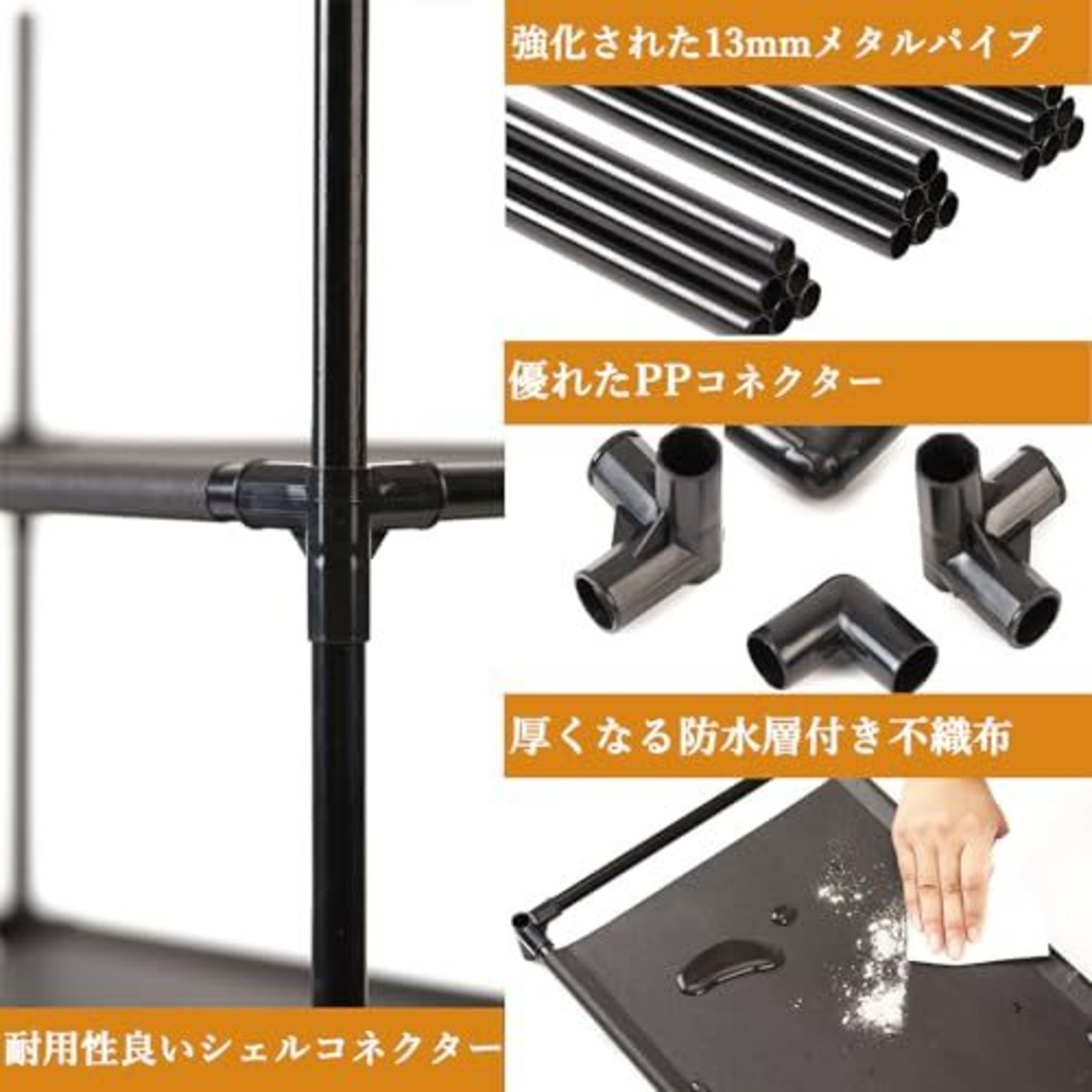 【進化した素材】1.直径13mmの太い鉄パイプ- コーティングした防錆で、優れた耐荷重、長く使っても変形しにくい。2.高級な防水層付き不織布- 厚い防水コーティングを施したので、水滴と埃を布巾で拭き取れやすい。3.高強度な耐摩耗ジョイント- 環境配慮型PPで作られ、パイプをしっかり支えます。