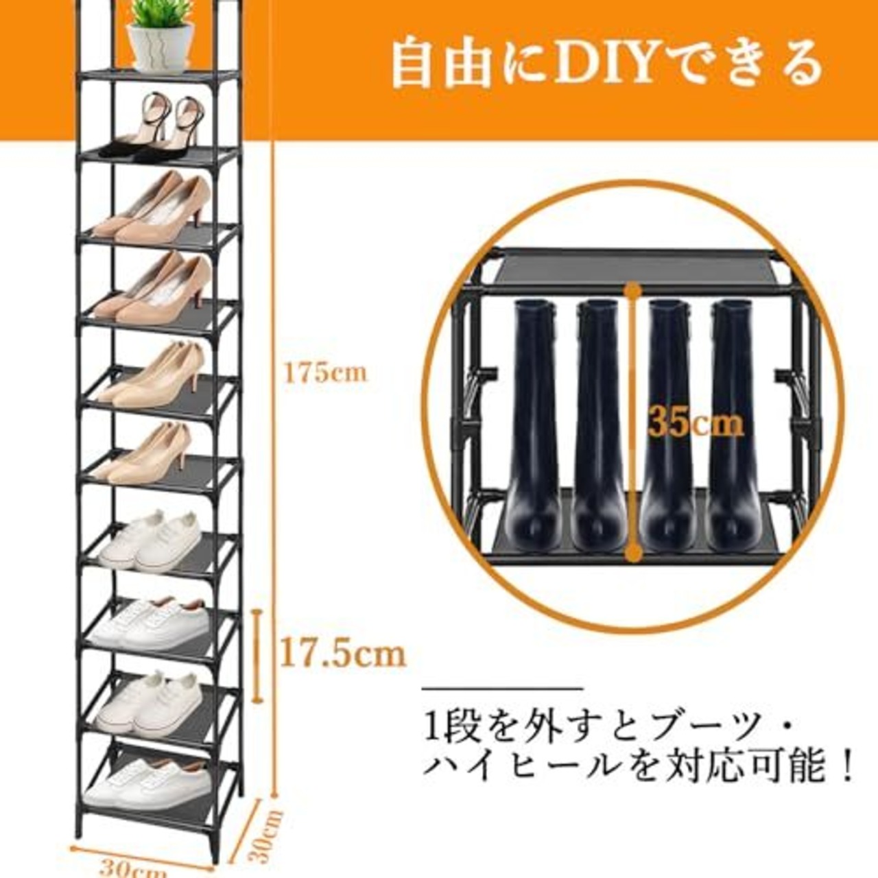 【スリムなのに大容量】奥行き30cmとスリムなので、限られたスペースの玄関でも、空間を圧迫せずにたくさんの靴を収納できます。棚は取り外せる設計ブーツなども収納可能です。大人の靴は10~12足も収納できます。