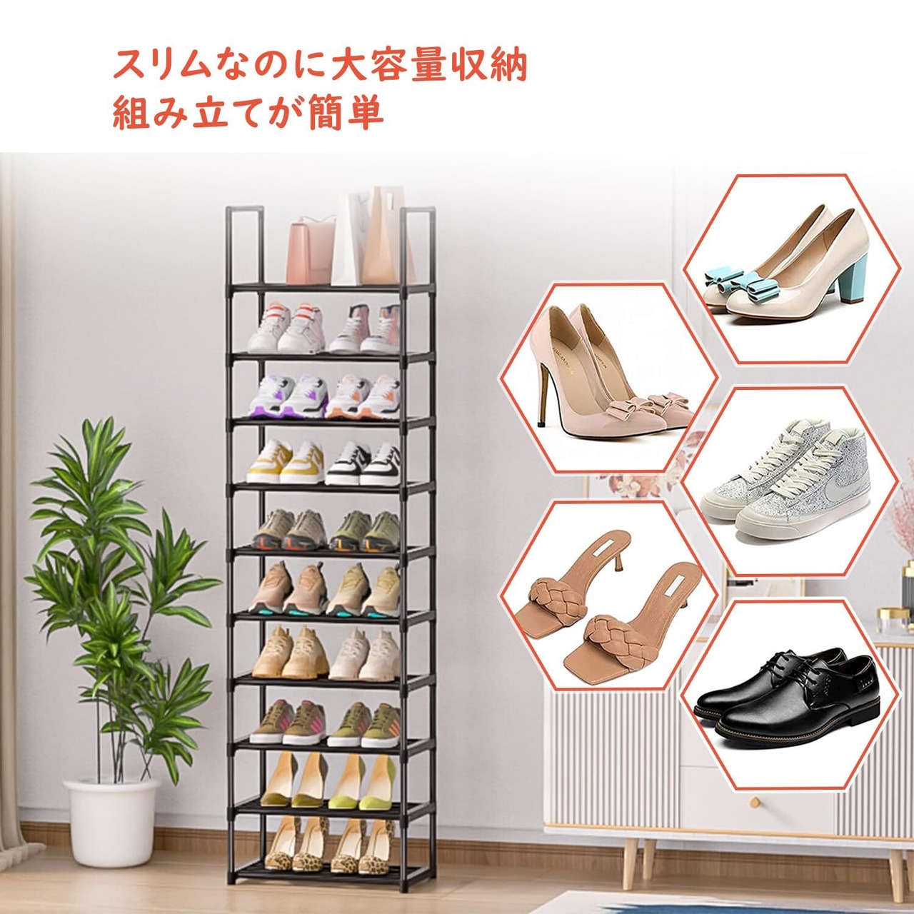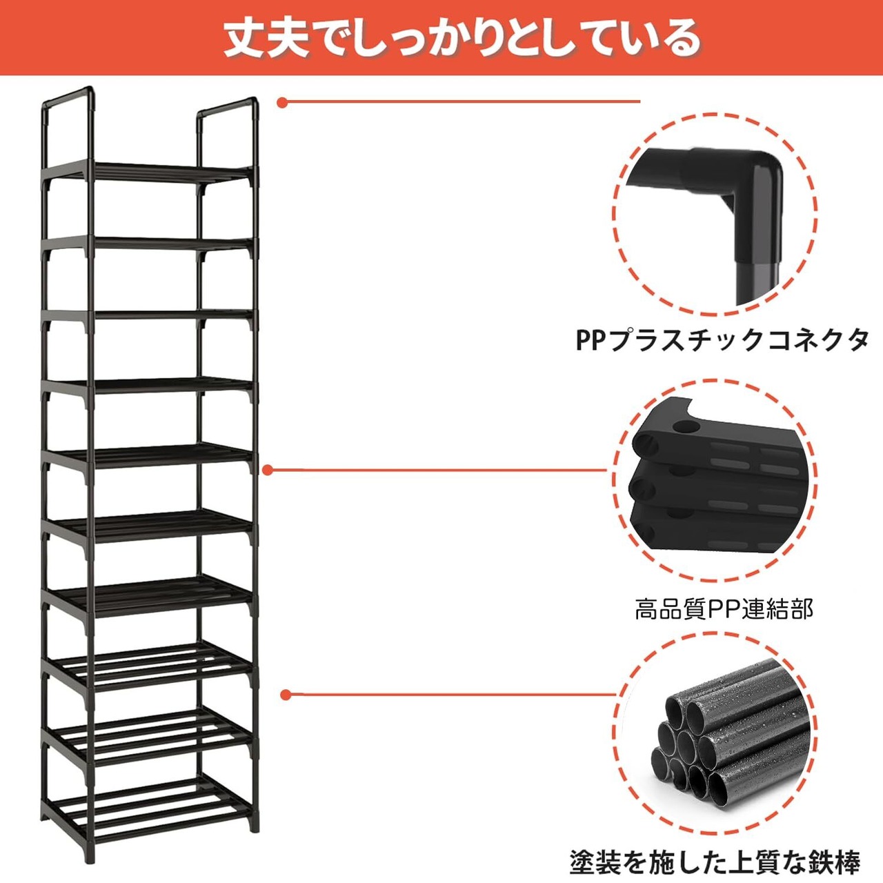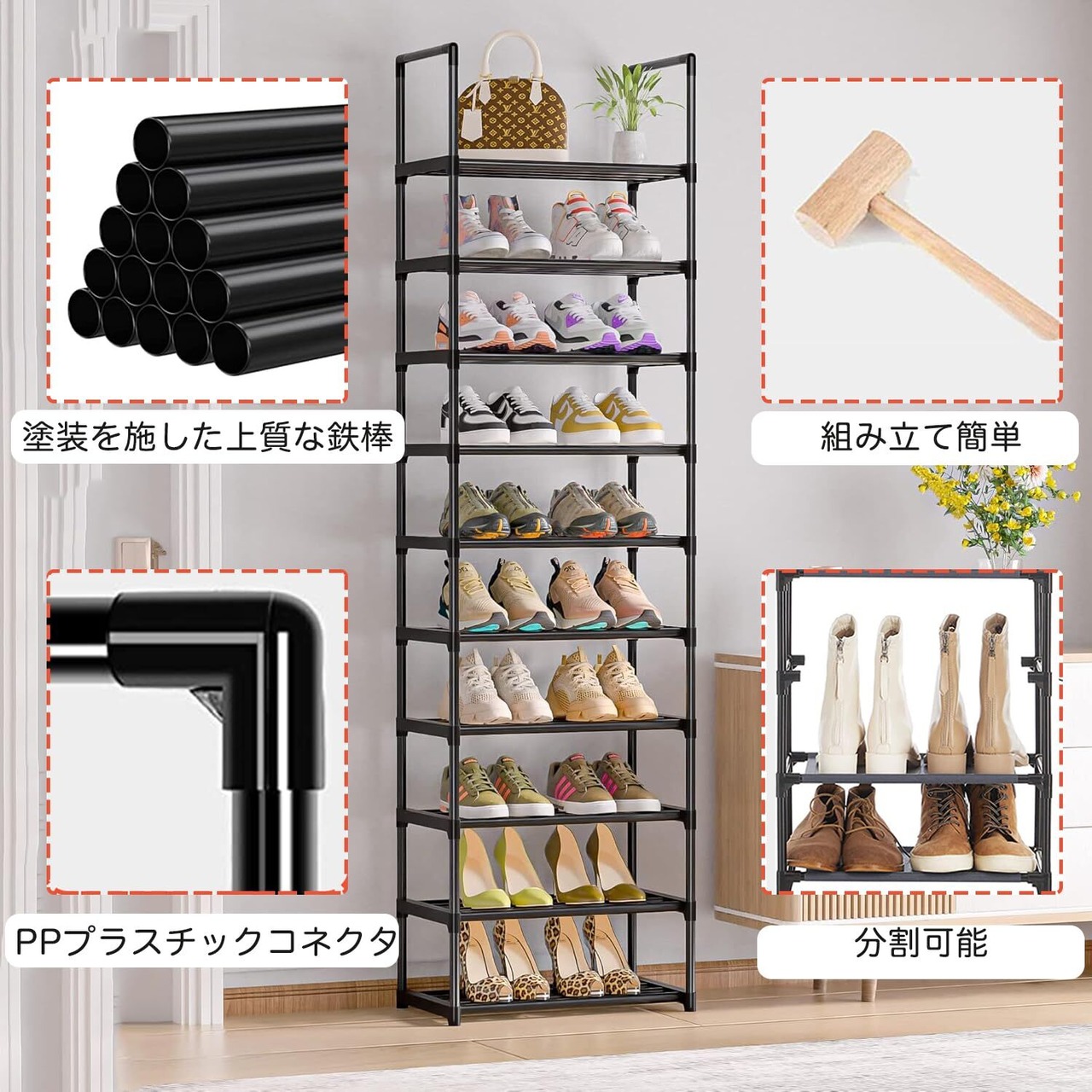 シューズラック 10段 大容量収納 省スペース スリム設計 玄関収納にぴったり 組み立て簡単 分割可能 幅45×奥行30×高さ176cm 靴棚 下駄箱 シューズボックス 靴整理ラック 日本語説明書付き(ブラック, 10段)