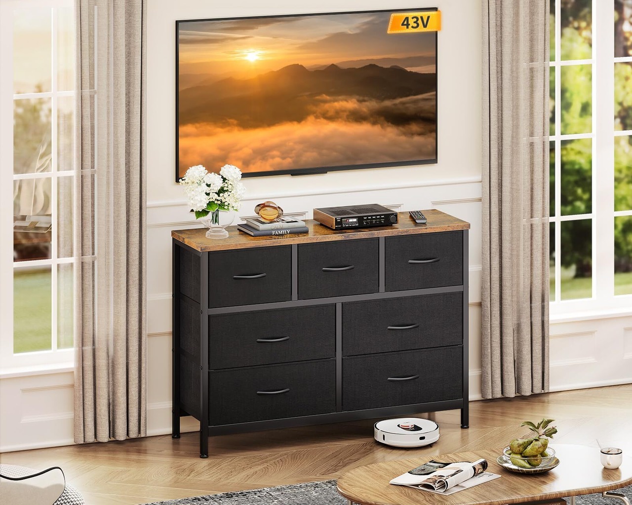 AODK チェスト タンス 棚 収納 幅100×奥行き30×高さ77.5cm たんす 大容量 リビング収納 洋服タンス 布製引き出し 衣装ケース 転倒防止 安定感 3段7杯 ブラック&ビンテージ