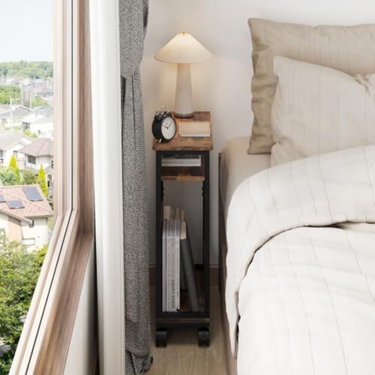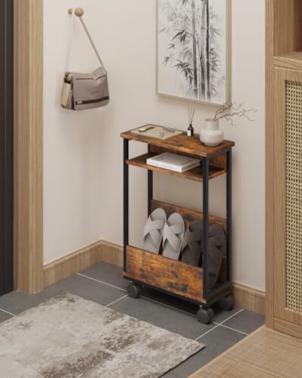 【数量限定】サイドテーブル スリム キャスター付き 幅40×奥行き18×高さ59.5cm サイドテーブル 収納 スリム ナイトテーブル ベッド横 おしゃれ ソファ テーブル スリム 木製 キャスター付きラック エンドテーブル 木目調 ブラウン
