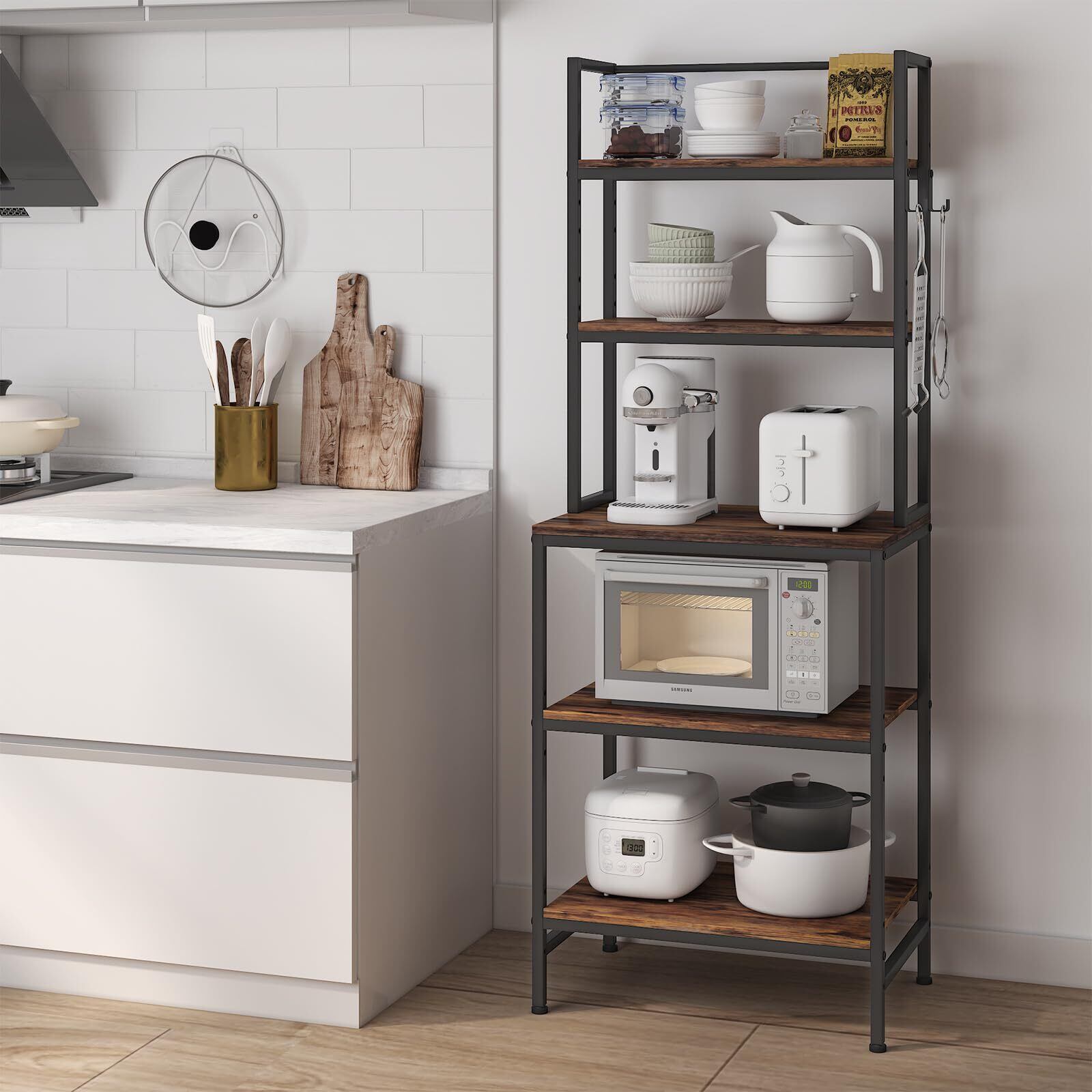 【多機能】この電子レンジ棚板は下段棚板が3段、上段棚板が2枚あり、ダイニングやキッチンに最適な収納棚です。 電子レンジ、オーブン、その他の台所用品や小物の保管、およびスパイス、皿、その他の必要な品物の保管に非常に適しています。 あなたのキッチンが整理されます!