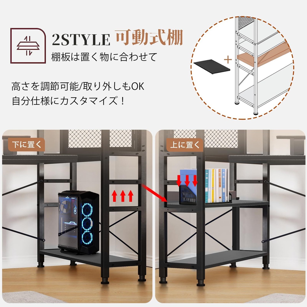 【多機能デザイン】このl型デスクは、多くの便利な機能が備わっています。多層の収納書棚(調節可能な棚板)や壁面に便利な収納パンチングボード、マルチ電源タップなど、さまざまなニーズに対応します。モニターアーム取り付けにも対応しています。お部屋のレイアウトに合わせて自由に左右組み換え可能。 LEDテープライトも付いて、色で雰囲気を変えましょう。機能性と品質の両方を兼ね備え、効率的な作業環境を提供します。