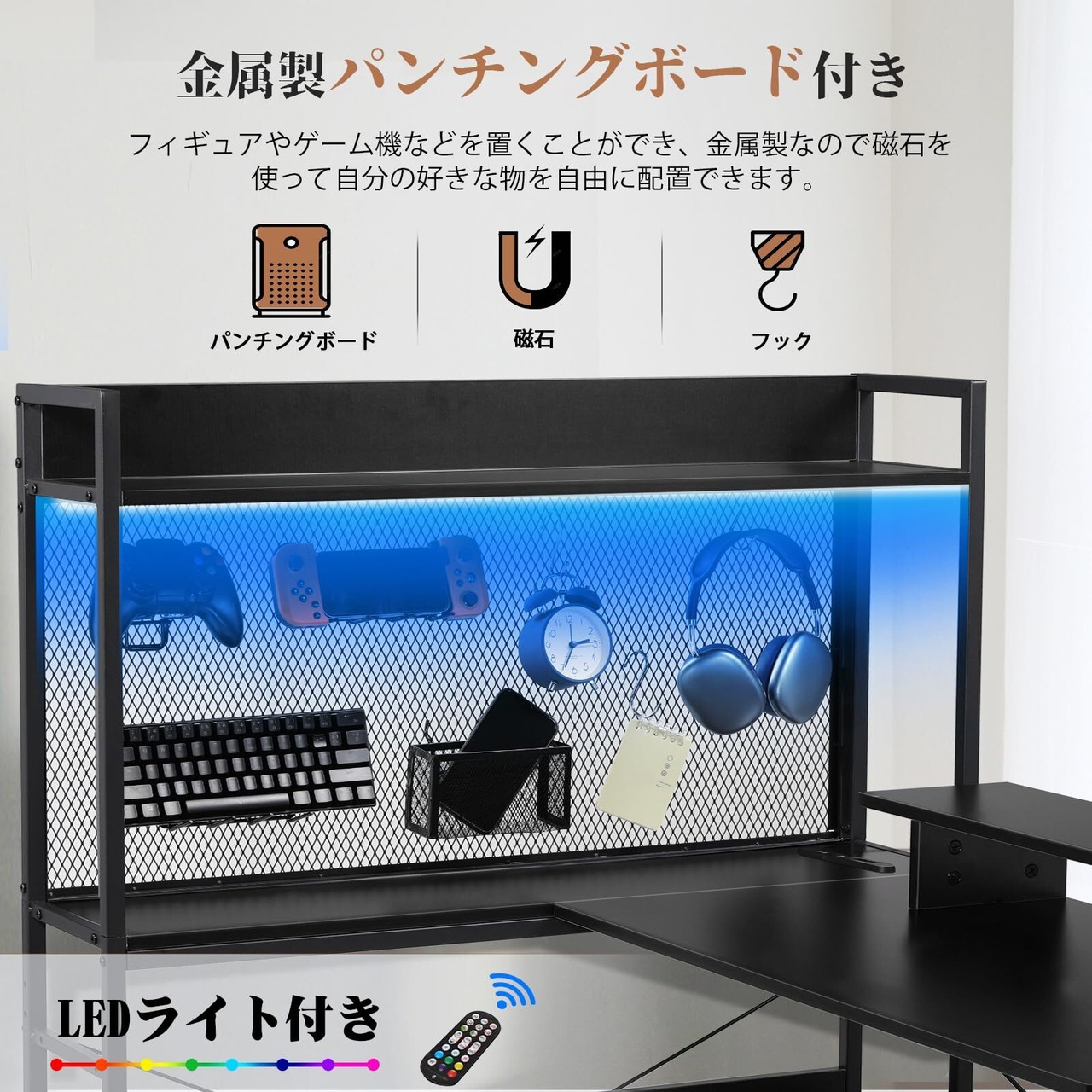 【在庫処分】COMHOMA ゲーミングデスク パソコンデスク l字 コンセント/棚/led付き モニターアーム対応 棚板高さ調節可能 多層収納 壁面収納 パンチングボード 頑丈なフレーム 左右組み換え自由 フック/ラック付き エコな板材採用 省スペース CD47-BT-1-black pcデスク l字デスク 作業机 l字型パソコンデスク