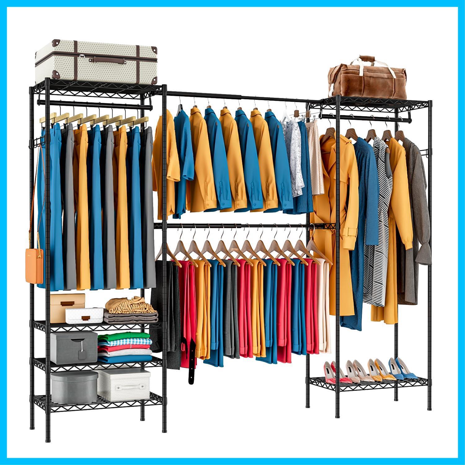 「様々な組み合わせタイプ」ポールに入った溝で棚板の高さが変えられるので、収納する物に合わせて、ムダなく最適なスペースで収納できます。伸縮ポール2本使わない時は、洋服かけラックは単独の2つの収納ラックに変身します!シンプル収納棚には衣類、日常の小物などを簡単に収納できるし、下に靴やポクッスなども便利収納できます。