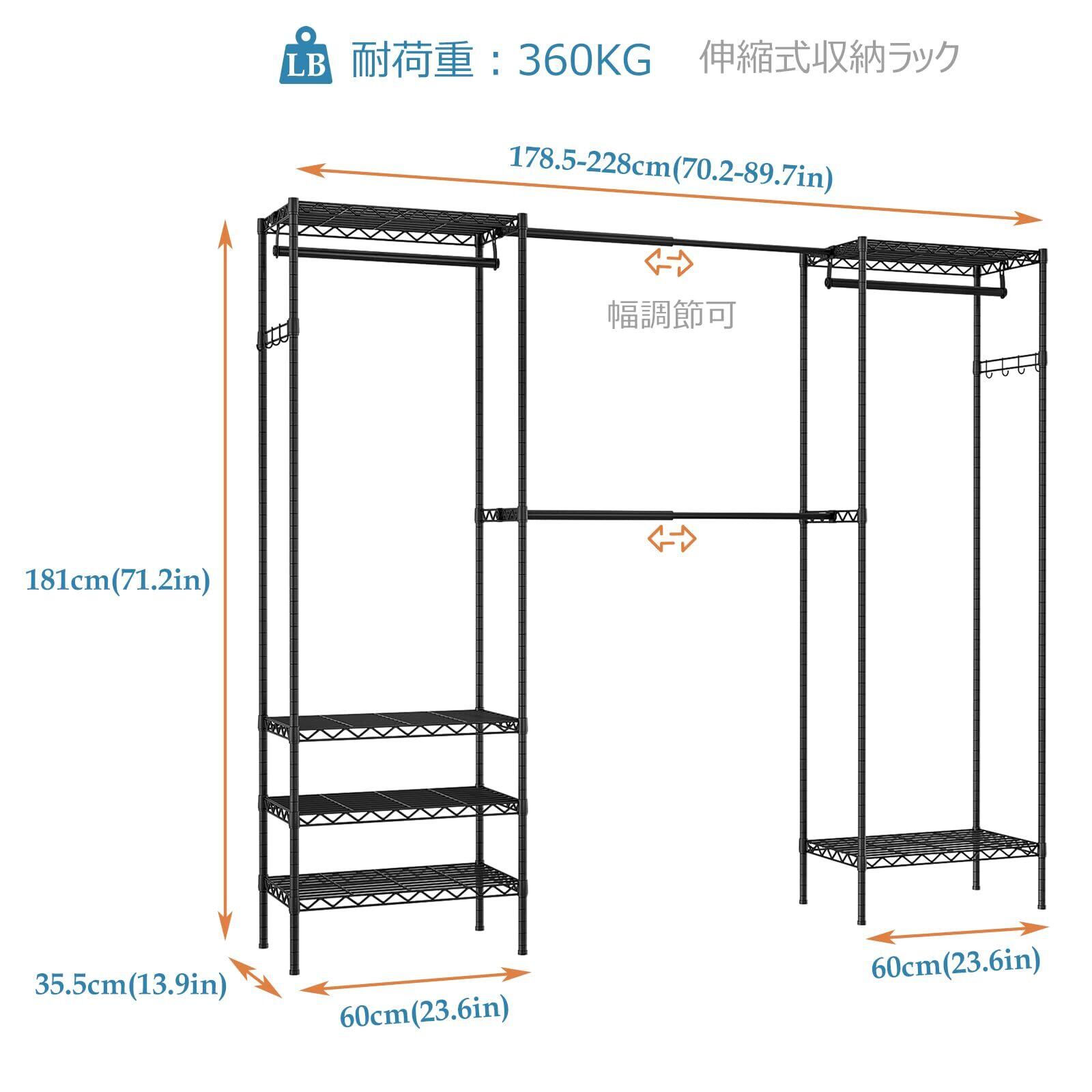 【特価セール】PASRLD ハンガーラック 幅調整可 伸縮式ワードローブ メタルラック 棚板高さ調節 コート掛け ラック本体 大容量 防サビ 頑丈 幅178.5~228*奥行35.5*高さ181cm (ブラック)