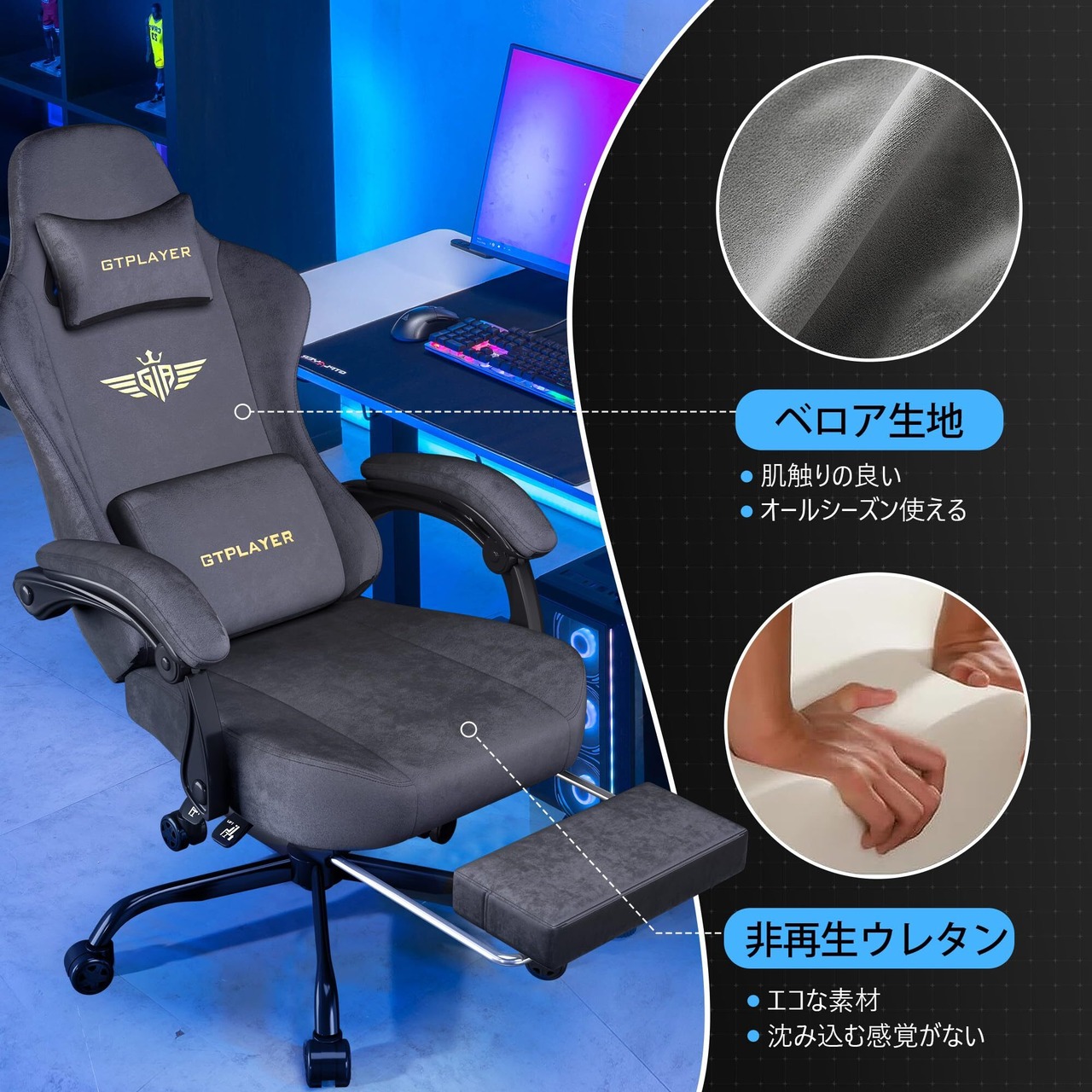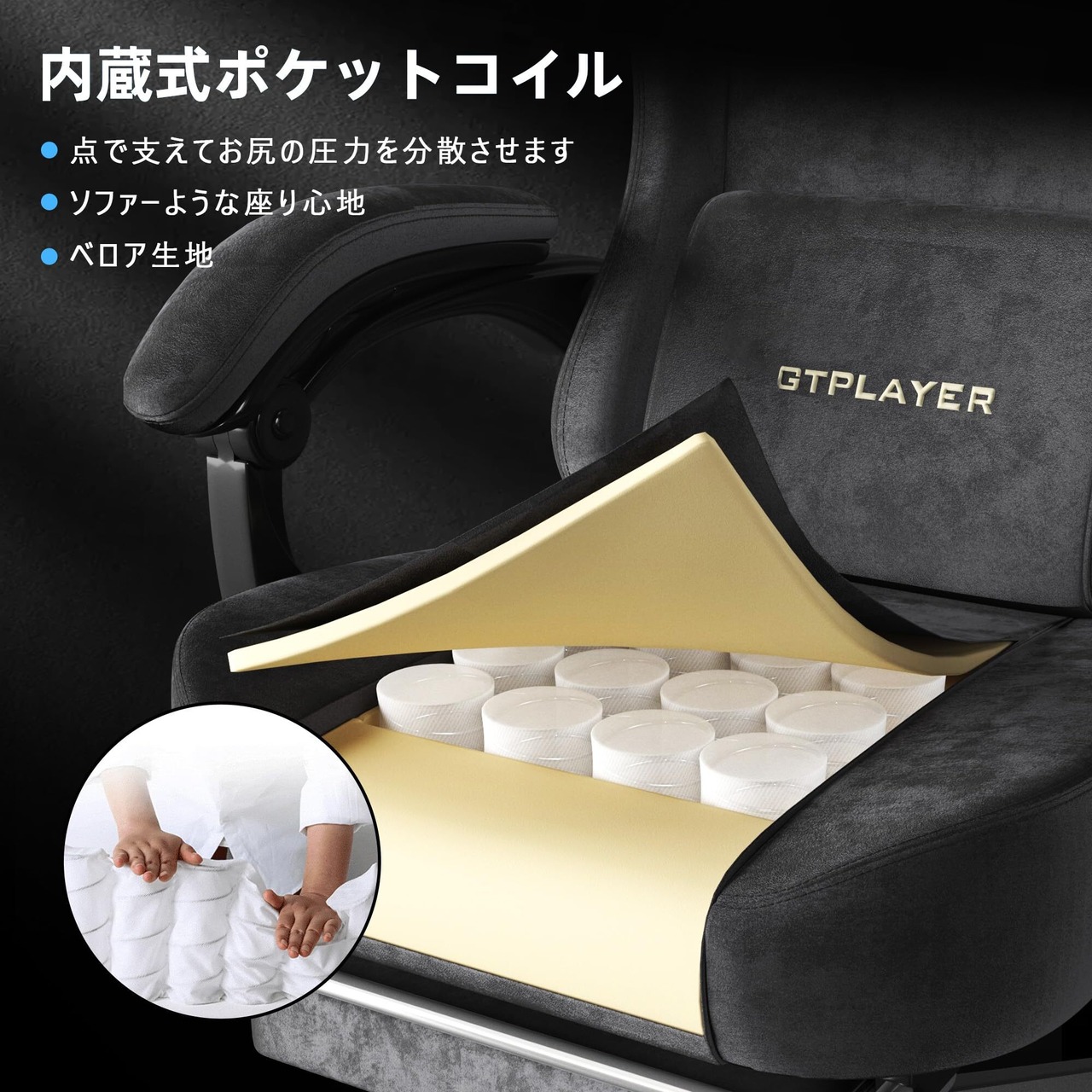 【数量限定】 GTPLAYER ゲーミングチェア なめらかなベロア デスクチェア オフィスチェア あぐら 椅子 ゲーム用チェア リクライニング ハイバック テレワーク椅子 PCチェア フットレスト 連動アームレスト ポケットコイル 座面の幅 50cm 四季適用 在宅ワーク 通気性 GT829-GRAY