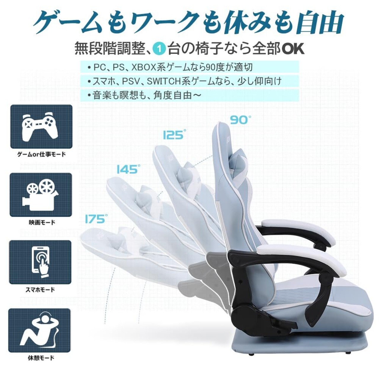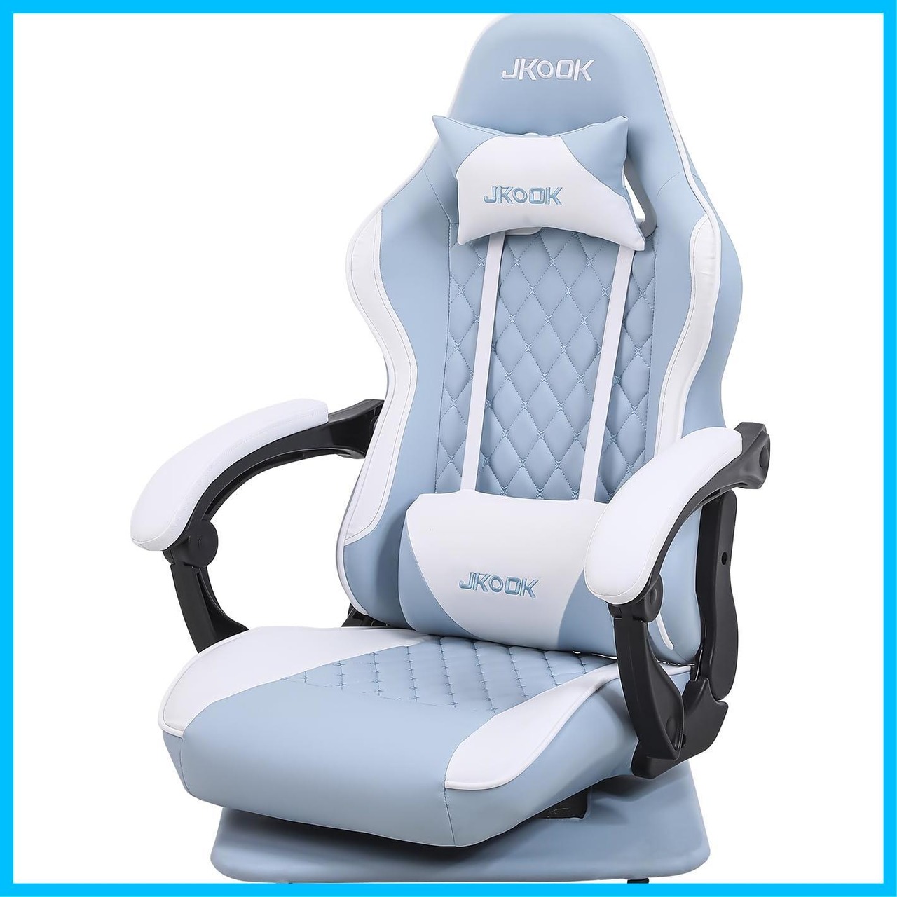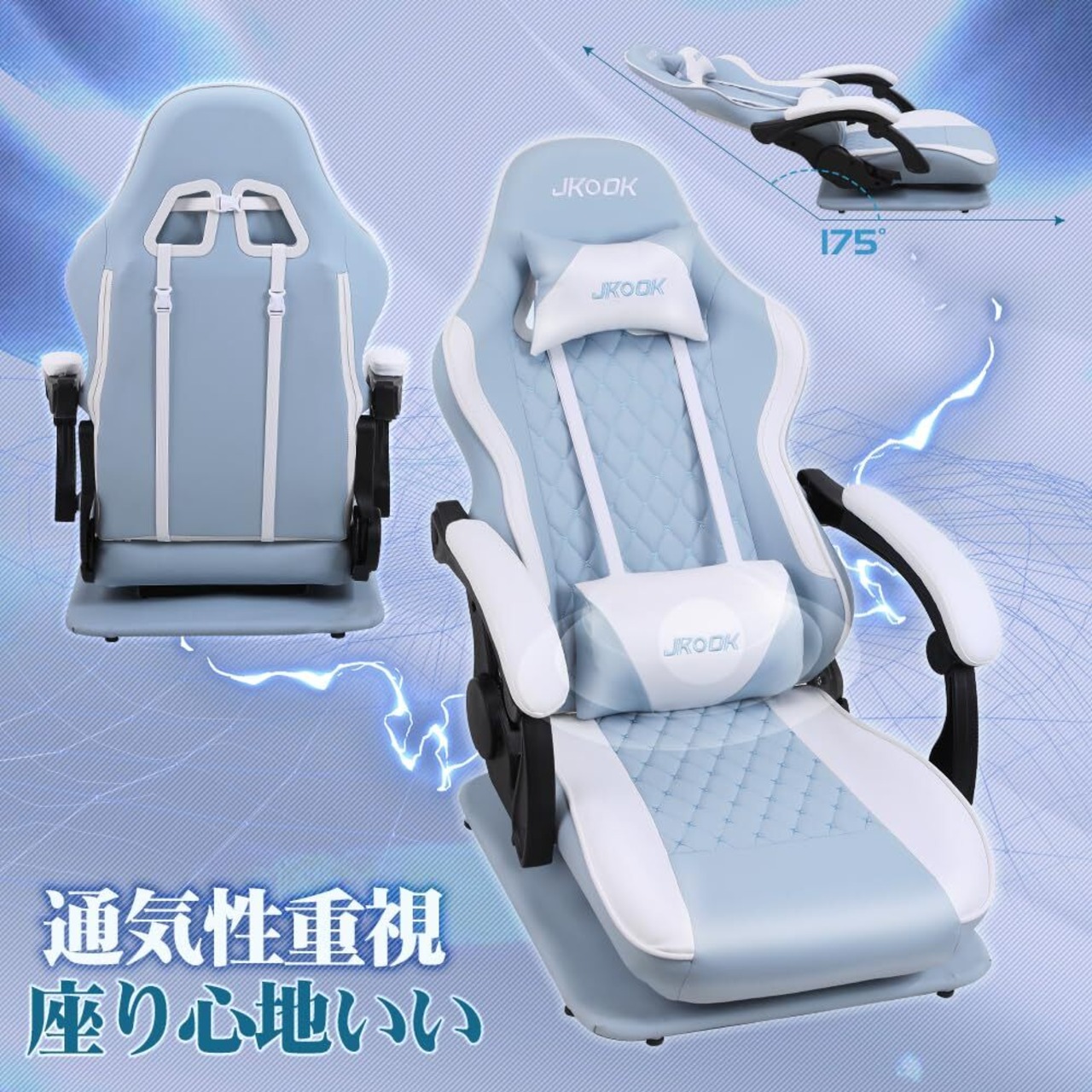 JKOOK ゲーミングチェア 座椅子 ゲーミング座椅子 通気性 振動機能 ゲーム用チェア リクライニング 回転座面 ハイバック ヘッドレスト ランバーサポート ひじ掛け付き PUレザー パソコンチェア JK07 (水色)