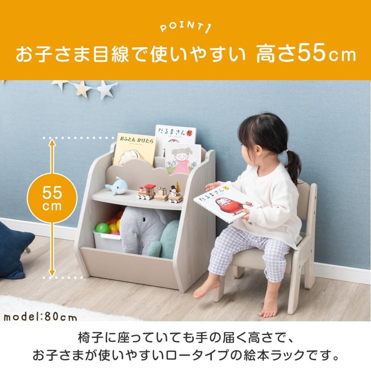 【スタッフのおすすめポイント】・おしゃれな木目調×かわいい雲デザイン・本の表紙がみえるディスプレイ収納・おもちゃ収納スペース付き・角に丸みをつけた安心設計・置きやすいコンパクトサイズ