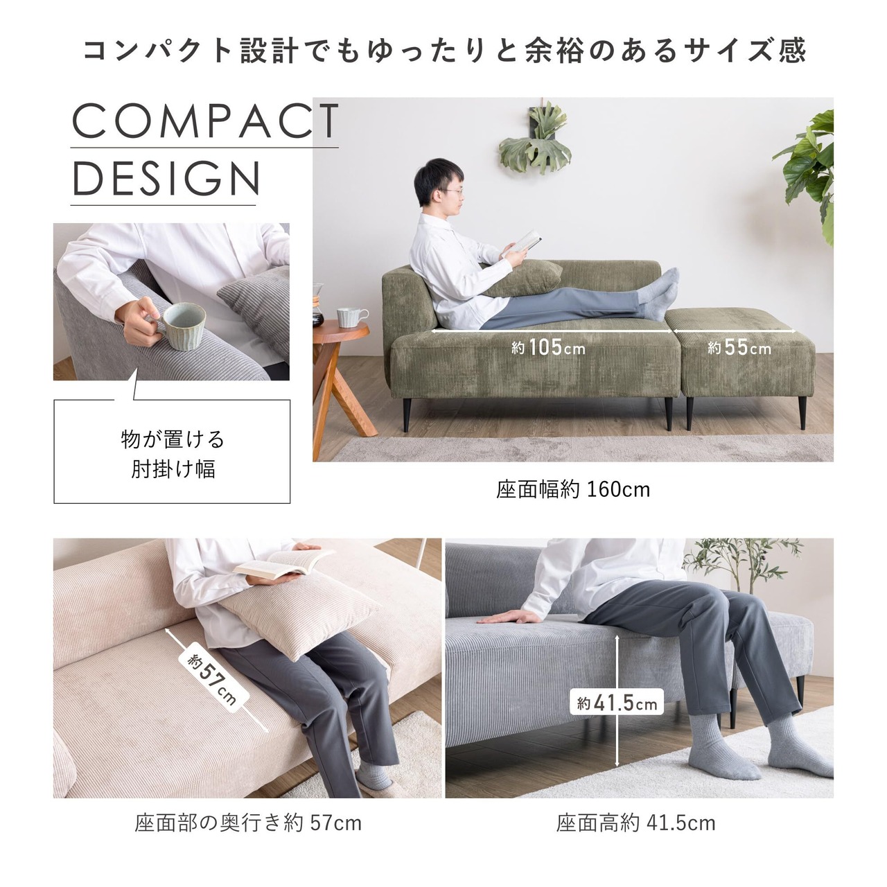 【コンパクト設計でもゆったりと余裕のあるサイズ感】 足を伸ばして寛いだり、大人2人が並んで座ることもできるゆったりサイズです。 あぐらをかいたり深く腰掛けたり、気分に合わせて自由にリラックスできます。 【固すぎず柔らかすぎない座り心地】 固すぎず柔らかすぎない座面部で座り疲れがしにくいバランスが取れた座り心地。 クッション材は柔らかさと弾力をもつシリコンフィルを使用。