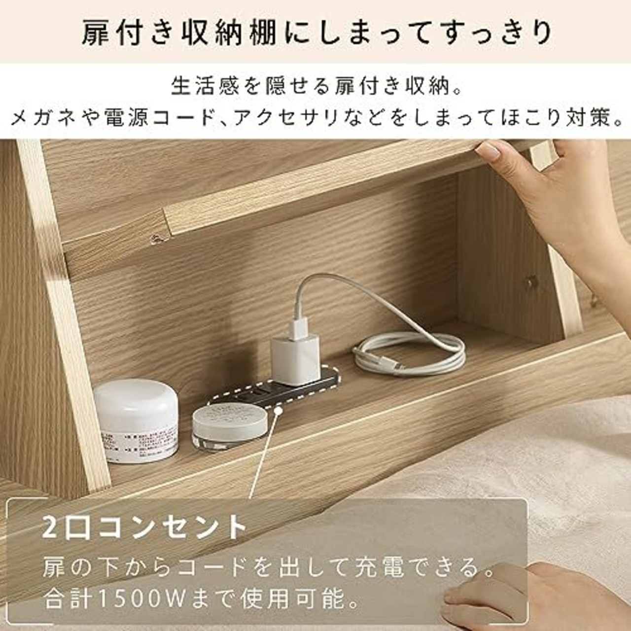 最大使用者体重:約120kg / 耐荷重:[ヘッドボード天板/宮棚]約10kg(※耐荷重は測定値であり、値ではありません。) / 電源仕様:[コンセント]2口×2[定格電圧]AC100V[定格周波数]50/60Hz[消費電力合計]1500Wまで