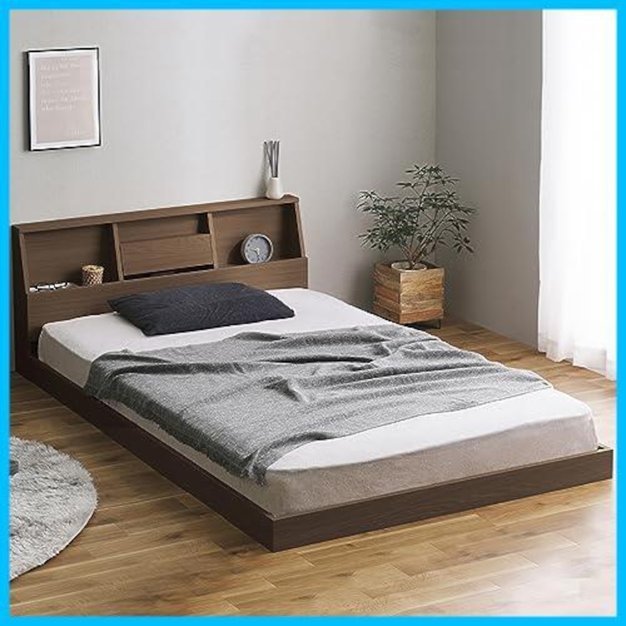 アイリスオーヤマ フロアベッド ダブル FBF-D ダブルウォールナット 2口コンセント スマホ、タブレットスタンド×2 収納付きヘッドボード 小物や電源コードを収納してホコリ対策 充電ケーブル等をすっきり隠せる