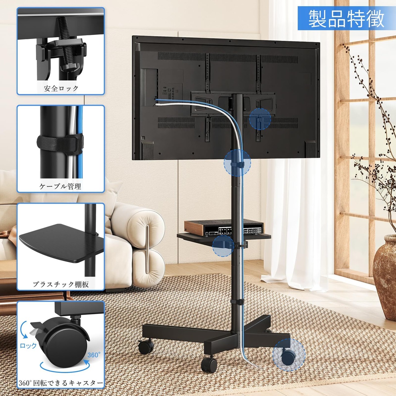 省スペース、ケーブル管理:テレビフロアスタンドの足が地面から十分低いので、多くのベッド、テーブルなどの下に隠れることができ、普通のテレビ台よりコンパクトで、高さも十分で便利に利用し、ロープロファイルのデザインで、省スペースです。また、後ろにはケーブル管理機能があり、部屋がスッキリになってグレードがアップした気分が出ています。