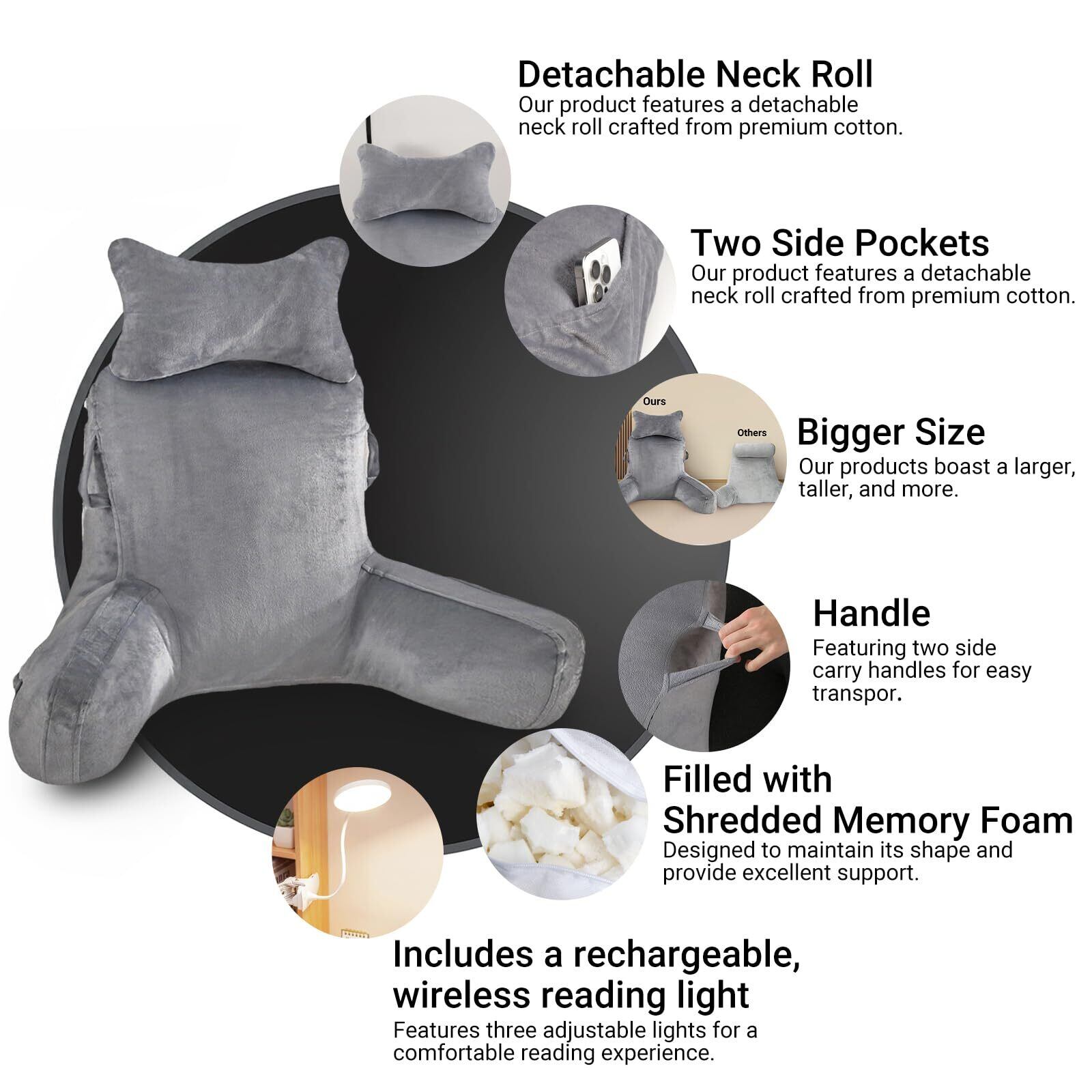 LIWEGHT 読書用枕、大型バックピロー、シュレッダーメモリーフォーム付きベッド用サポートピロー、アーム付きベッドチェア用のシットアップ枕、ポケットと洗えるカバー、大人用バックピロー(読書/テレビ視聴/ゲーム/リラックス用)