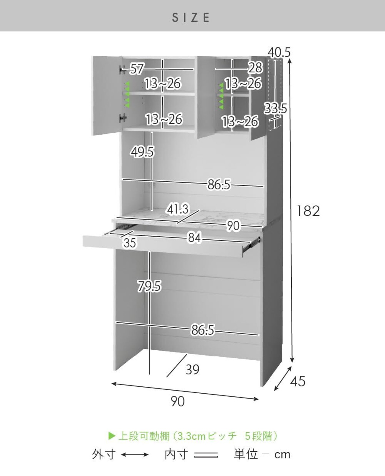 【サイズ】約幅90×奥行き45×高さ182cm 【オープン収納サイズ】約幅86.5×奥行き41.3×高さ49.5cm 【スライド棚サイズ】約幅84×奥行き35cm