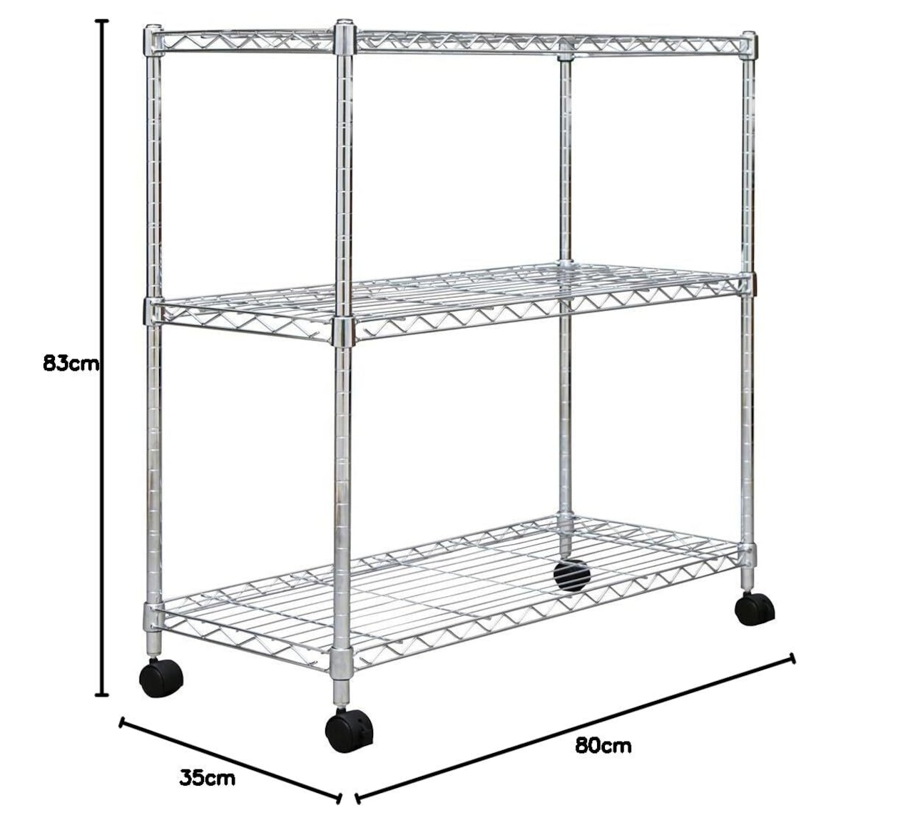 材質/棚板・ポール:スチール(クロームメッキ仕上げ)、キャスター:ナイロン樹脂、棚板固定部品:ABS樹脂