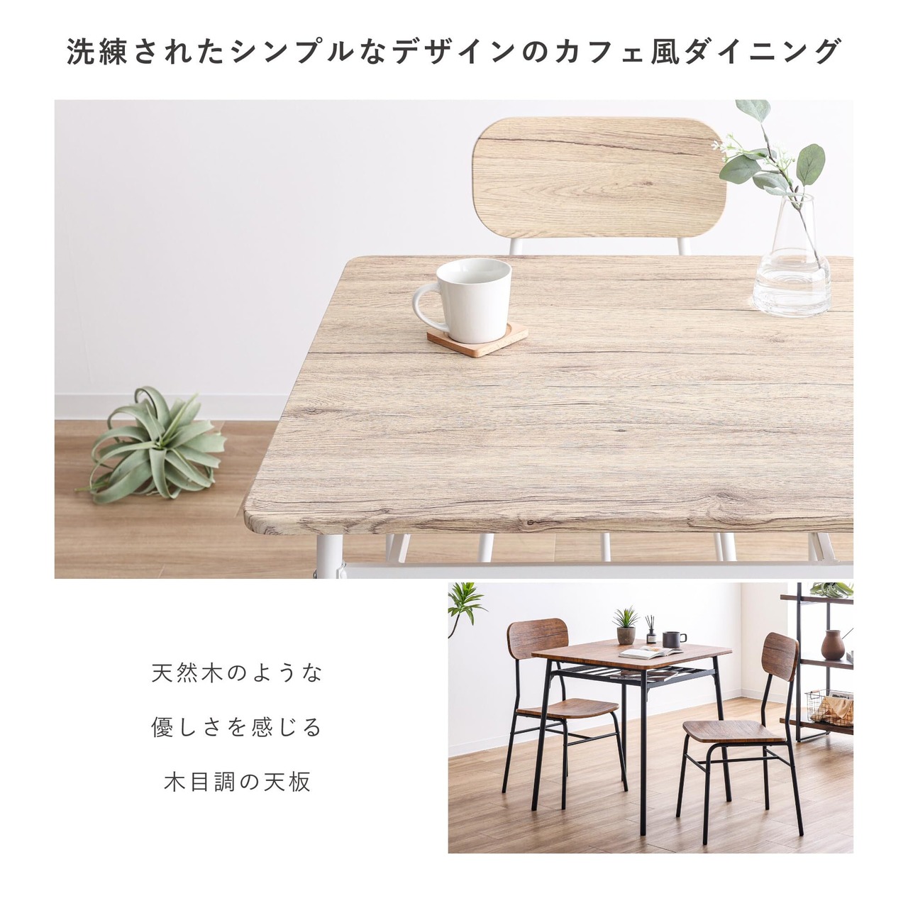 【スタイリッシュさと温もりが組み合わさったダイニング】すらりと真っ直ぐに伸びるスチール素材の脚部のスタイリッシュさ×天然木のような優しさを感じる木目調の天板が組み合わさった洗練されたシンプルなデザインが、毎日の暮らしを引き立てるカフェ風のダイニング。また、テーブルとチェアは全体的に丸いフォルムに仕上げ、柔らかな雰囲気がより温かみを感じられるダイニングセット。【優しさ溢れるリアルな木目模様が美しい天板】温もりが溢れる本物の天然木のようなやさしさを感じられる美しいプリント紙化粧繊維板仕上げの天板。木のやさしい風合いを感じながら毎日の暮らしに欠かせない家族の憩いの時間を明るく穏やかな空間に。