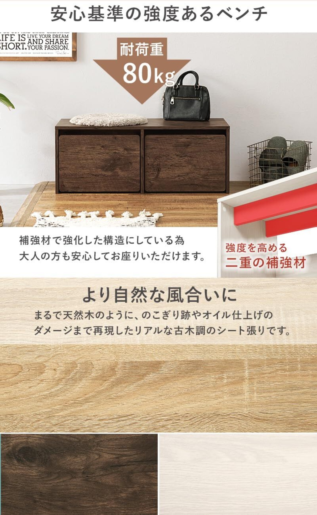 【安心基準の耐荷重80㎏】補強材で強化した構造にしている為、大人の方も安心してご利用頂けます。