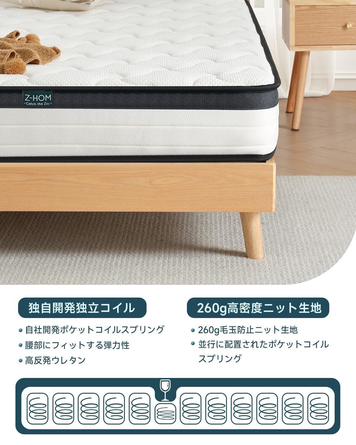 「️3. 体圧分散とサポート力」体圧分散に優れており、快適な寝姿勢をサポートします。Z-HOMポケットコイルマットレスは、体のラインに沿って沈み込み、体圧を均等に分散します。これにより、腰や肩への負担を軽減し、快適な睡眠を提供します。また、高反発ウレタンを使用しており、しっかりとしたサポート力を持っています。