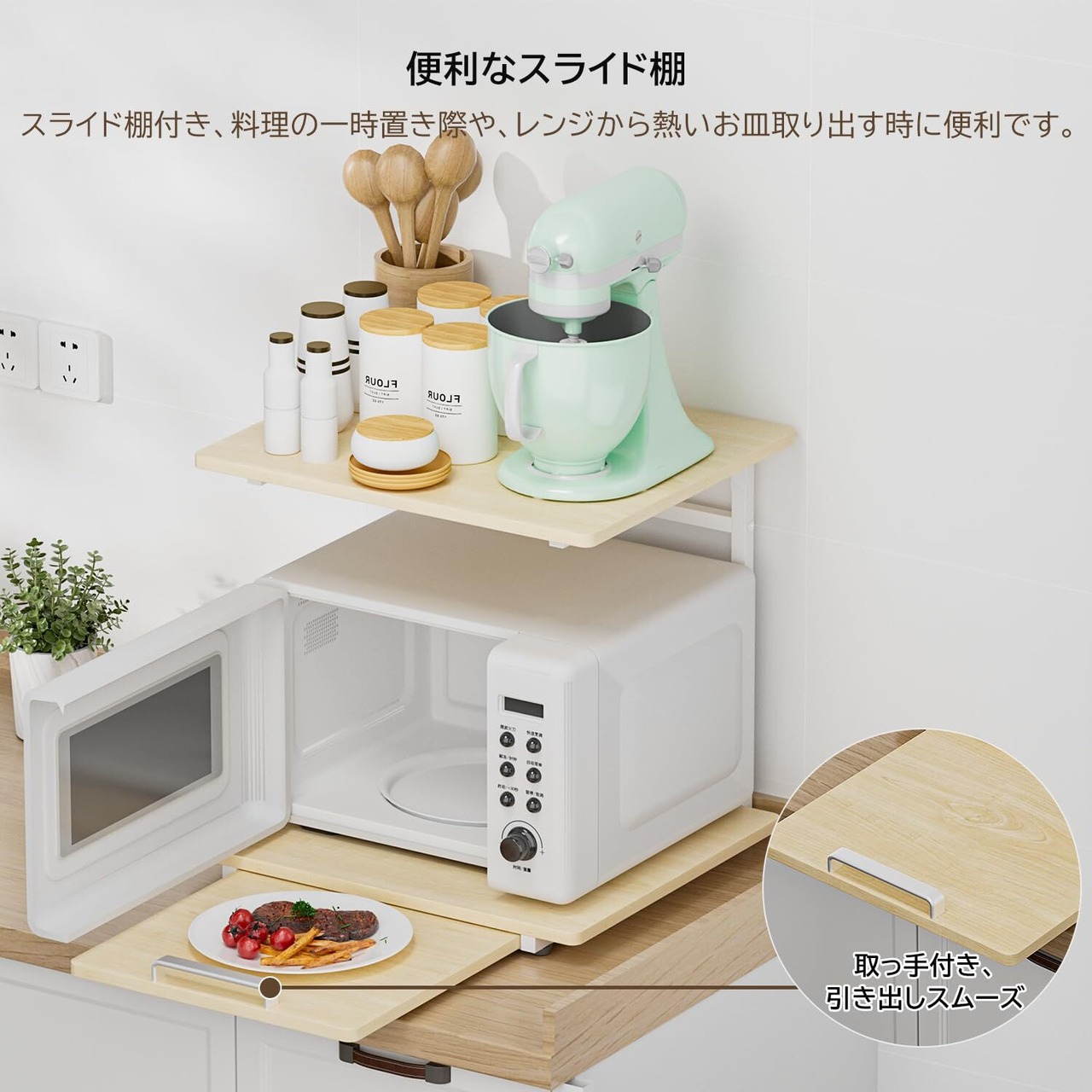 【スライド棚付き】一番下にスライドトレーが設計され、熱いお皿や料理を電子レンジから取り出す時に、一時置き台として使えるのが便利です。コーヒーメーカーを置く場合、こーひカップをスライド棚に置けて、収納スペースになります。スライド棚を使用しないときは奥まで収めて、邪魔になりません。取っ手も備え引き出しスムーズで楽々です。