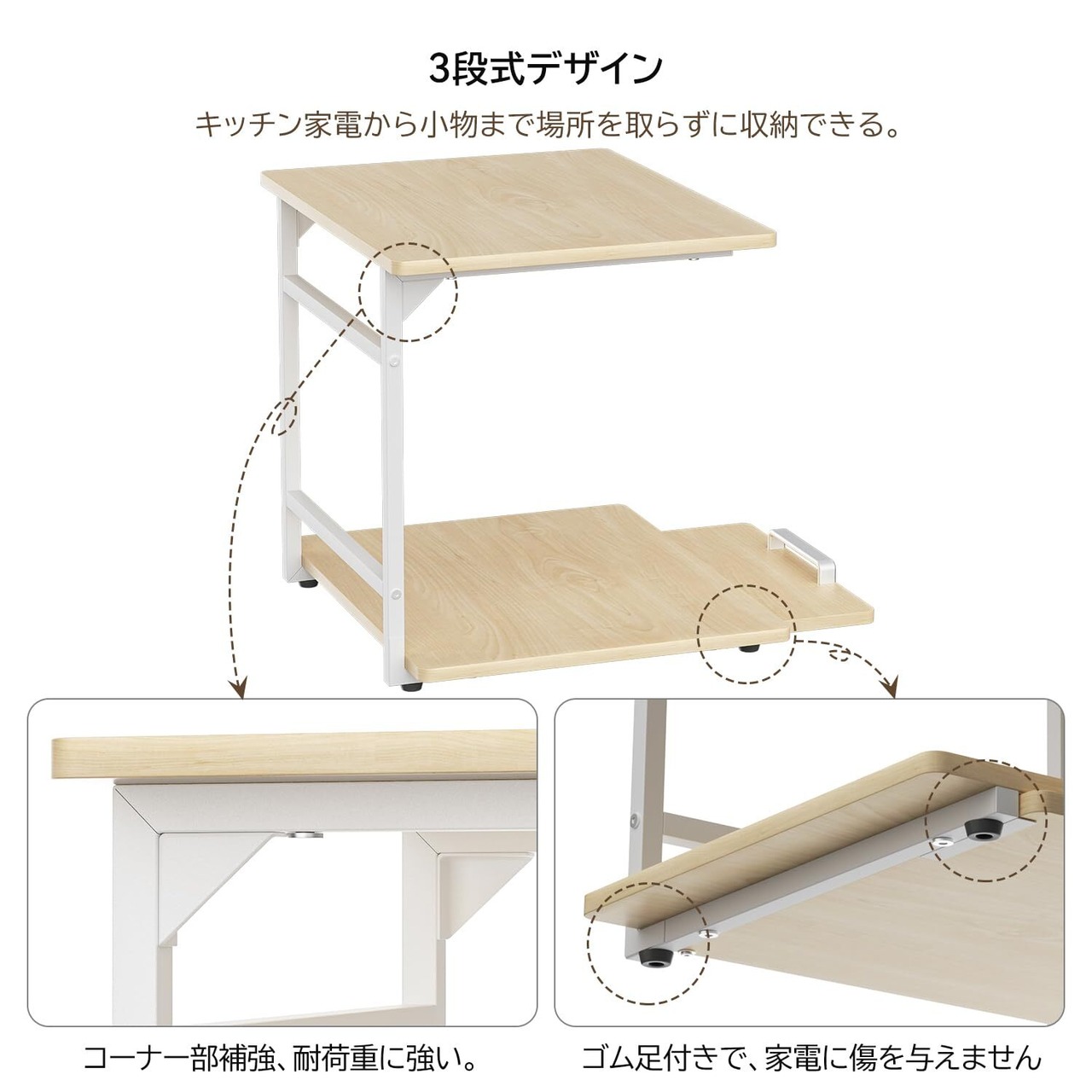 【レンジラック】冷蔵庫ラックは3段式デザインで、キッチン家電や小物を仕分けして格納できます。オーペン式なので、必要な物をおいて置けるに便利し、取り出しもやすいです。頑丈で高耐久なスチールや分厚な木材を採用され、電子レンジ、オーブンレンジ、炊飯器、トースターや、ポット、コーヒーメーカーなど普段使う重たい家電も置けます。