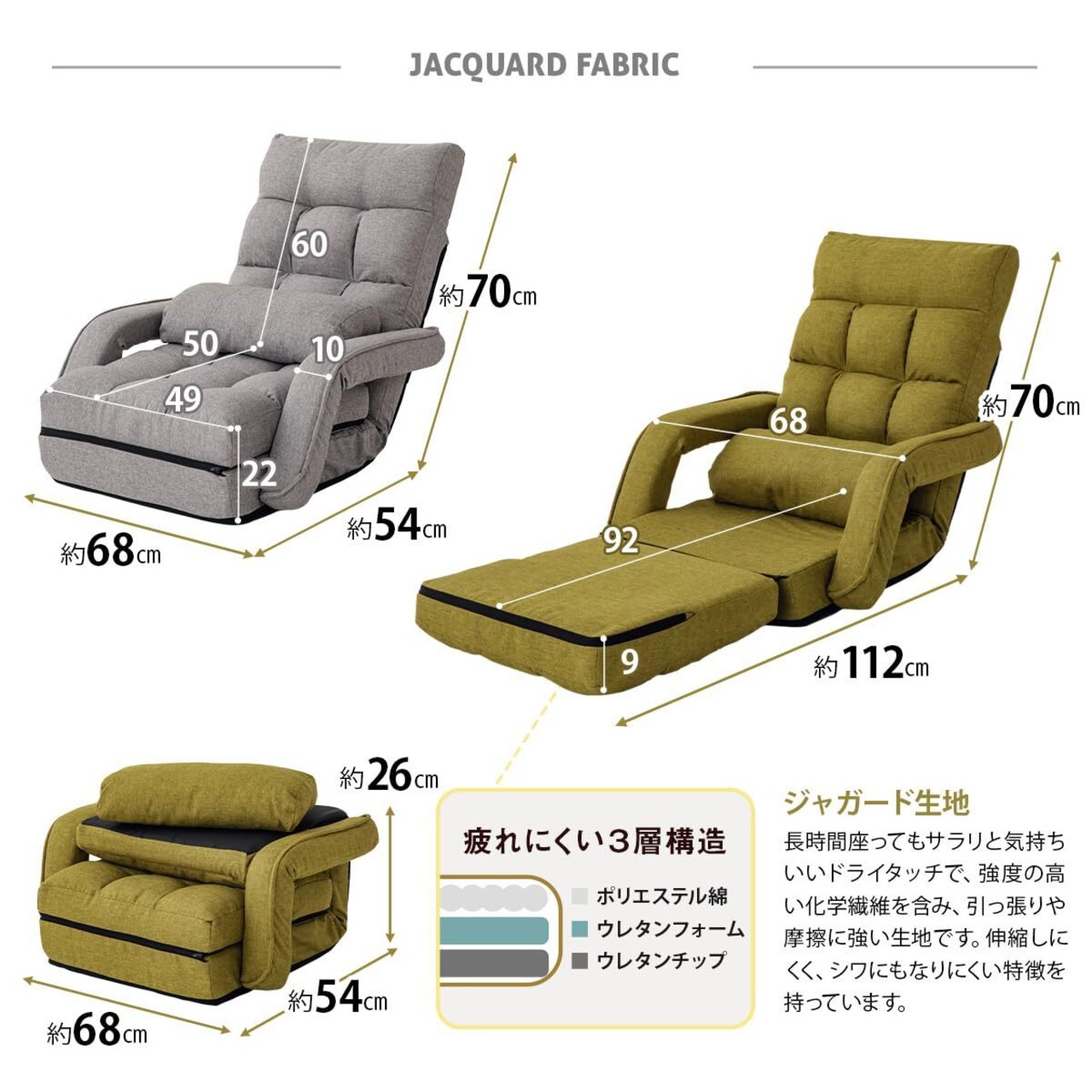 3way スタイル リラックスフロアチェア ■オットマン 座面を広げれば優雅なオットマンスタイルチェア。 ■チェア 折りたためば厚みたっぷりなハイチェア。 ■ベッド フラットにすればお昼寝に最適な簡易ベッド。