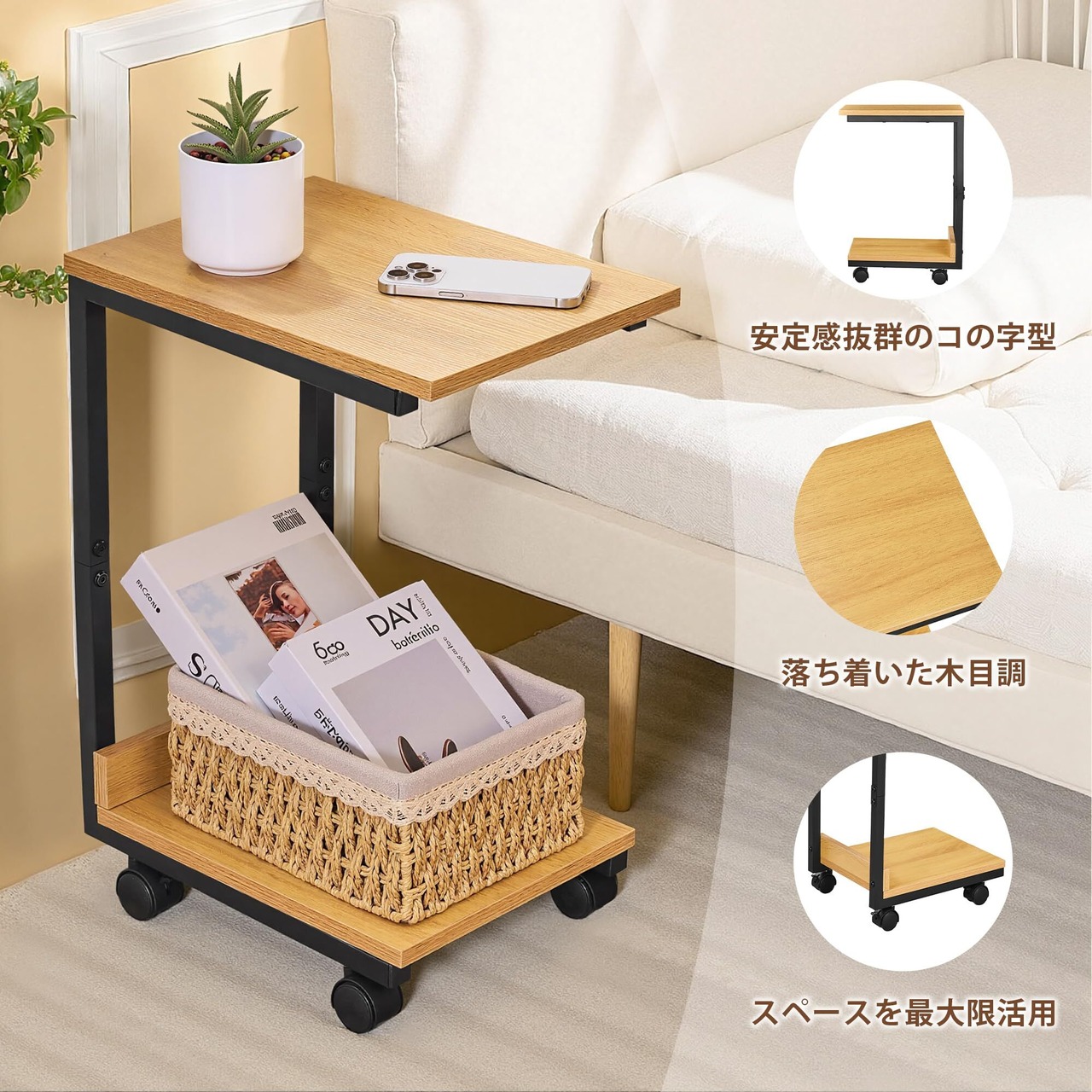 VECELO サイドテーブル キャスター付き 幅約37×奥行約26×高さ約53cm コの字型 2段収納 ミニテーブル ベッドサイドテーブル ソファ横 ベッド横 C形茶卓 北欧風 おしゃれ 木目調 コンパクト 省スペース ナイトテーブル かんたん組立 スリム