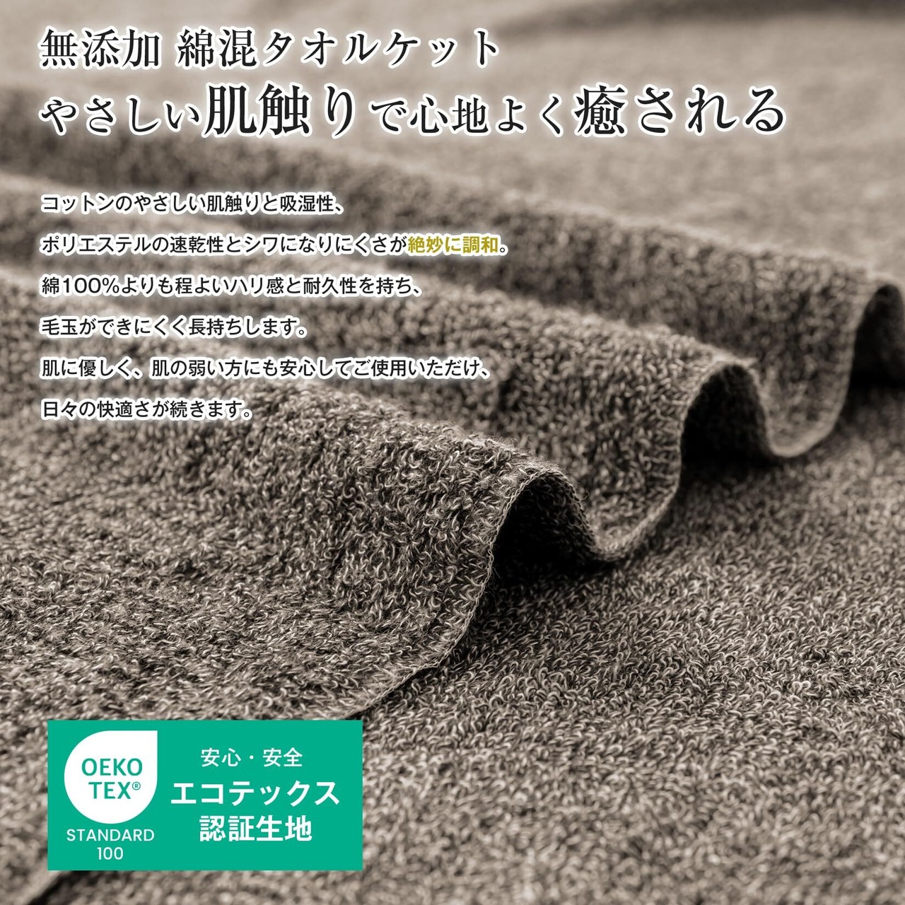 【無添加・安心のOEKO-TEX認証】信頼感を与えるOEKO-TEX認証を取得したタオルケットです。静電気を抑え、肌に優しく刺激が少ないため、肌への負担を軽減し、安心してご使用いただけます。