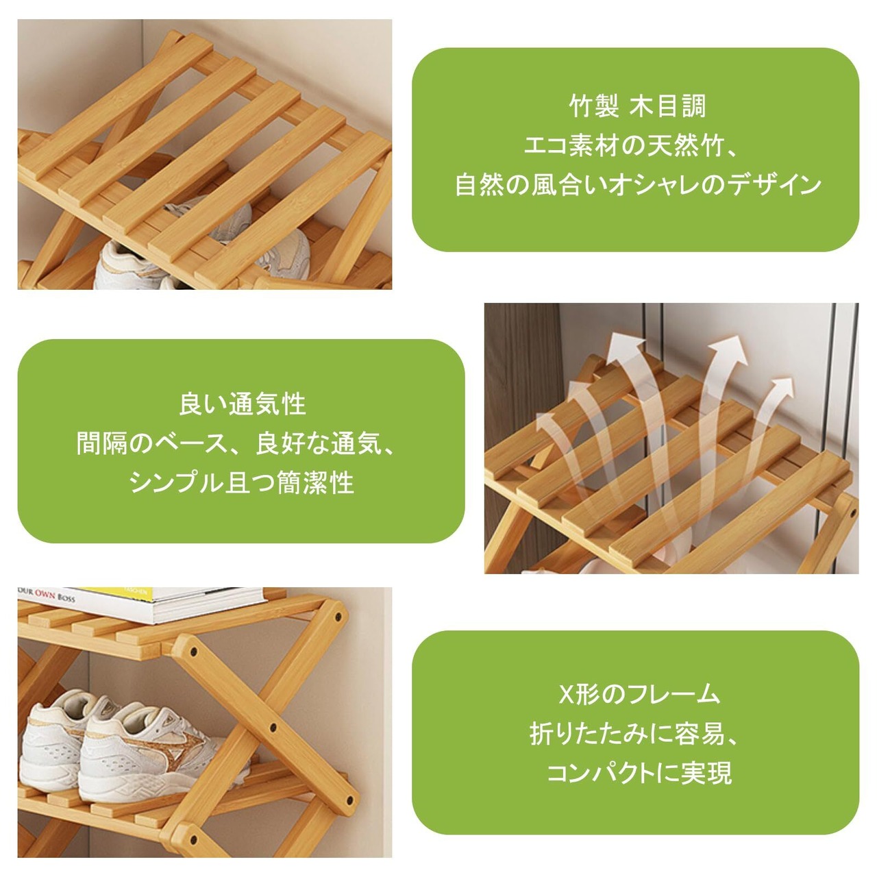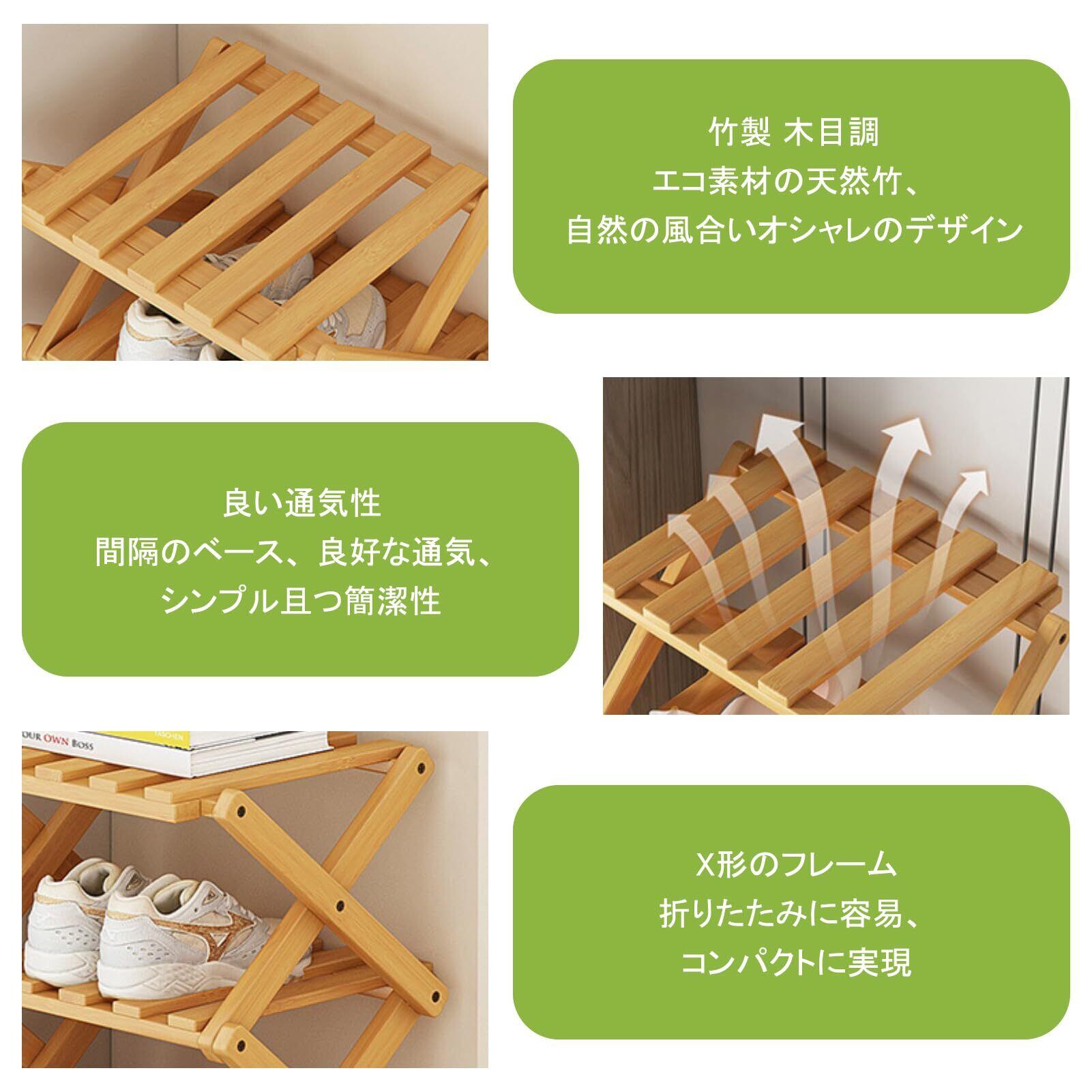 【天然竹の高級素材】: この竹製シューズラックは天然竹を使用し、エコで健康的。竹の独特な木目がナチュラルな美しさを演出し、インテリアに自然に溶け込みます。防カビ・防虫加工済みで長期間清潔を保ちます。軽量で美しく、スペースを取らず、玄関や部屋にシューズラックとして最適です。