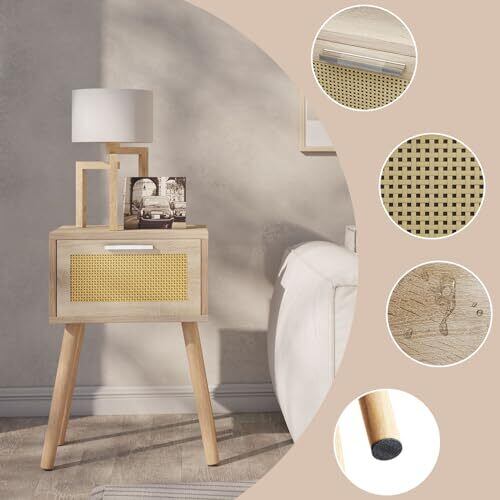 YMYNY ナイトテーブル サイドテーブル 籐編み前板 MDFボード 木目調 ラタン風 木製 脚付き おしゃれ 簡単組立 コンパクト ナイトスタンド ソファテーブル ベッドサイドテーブル サイドキャビネット 一人暮らし 和風 小物収納 寝室 玄関 ナチュラル HST010N