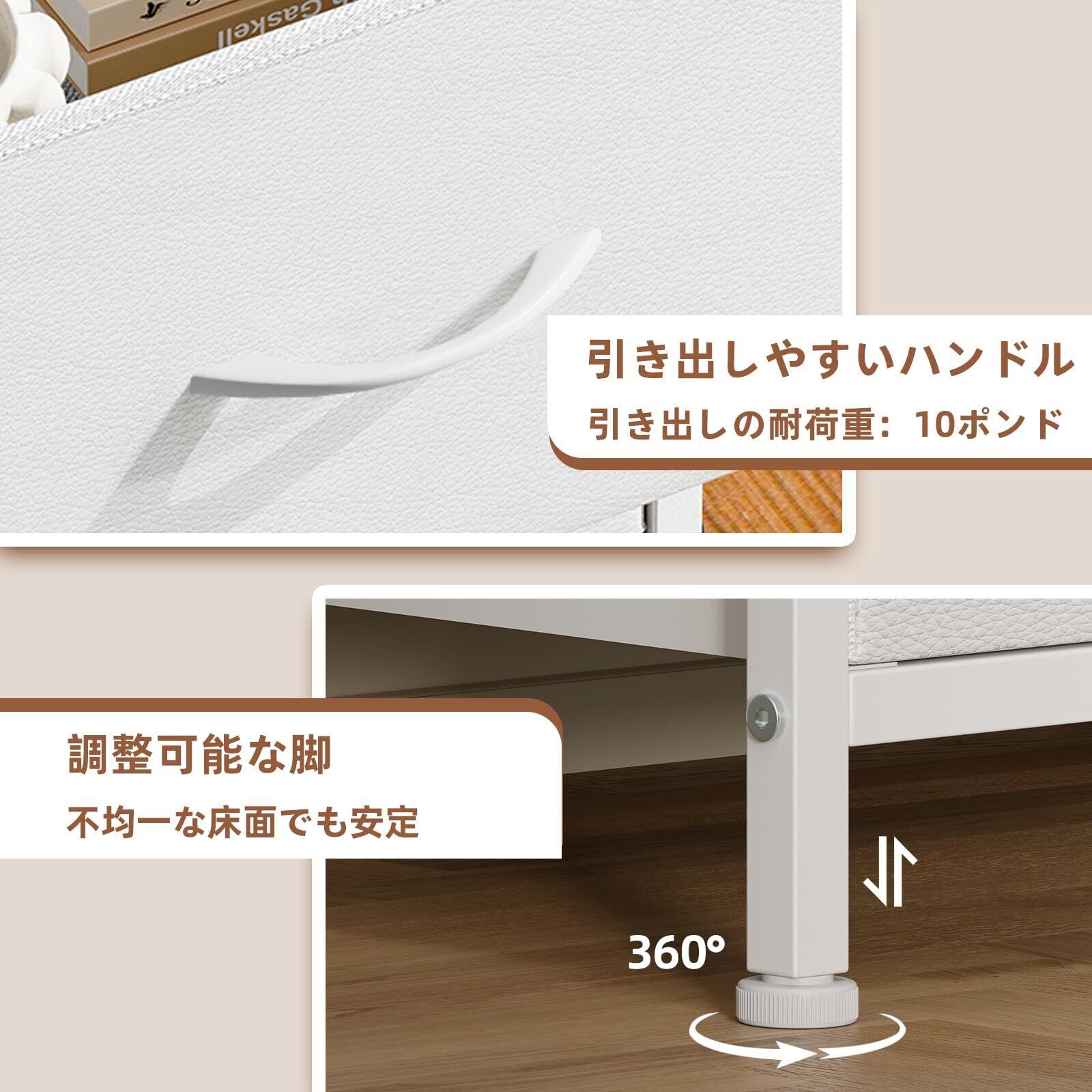 【体に優しい素材を採用】チェストのフレームは上質で頑丈なスチール素材を採用されるため、長持ちのうえ、安定性・耐摩耗性に優れています。しっかりとした構造なので、安定してぐらつきません。通気性がよく丈夫な不織布製の引き出しにはハンドルが付きで、スムーズに開け閉めできます!それに質感がよい木目調の天板はエレガントで、柔らかい雰囲気を!