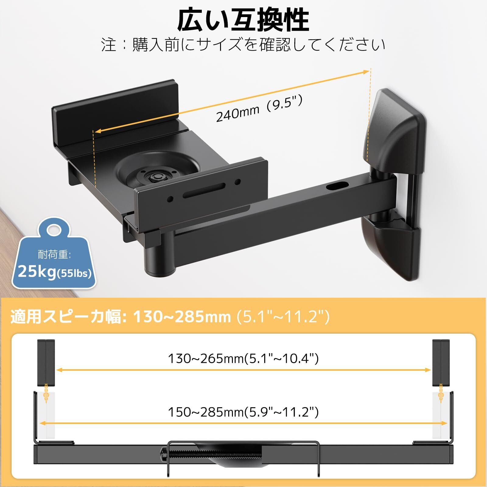 WORLDLIFT 大型スピーカー 壁掛け金具 耐荷重各25kg スチール製 スピーカ壁掛けブラケット 幅130-285mm 10°上下/左右傾斜/ 360°回転/アームは左右に45°回転 2個セット