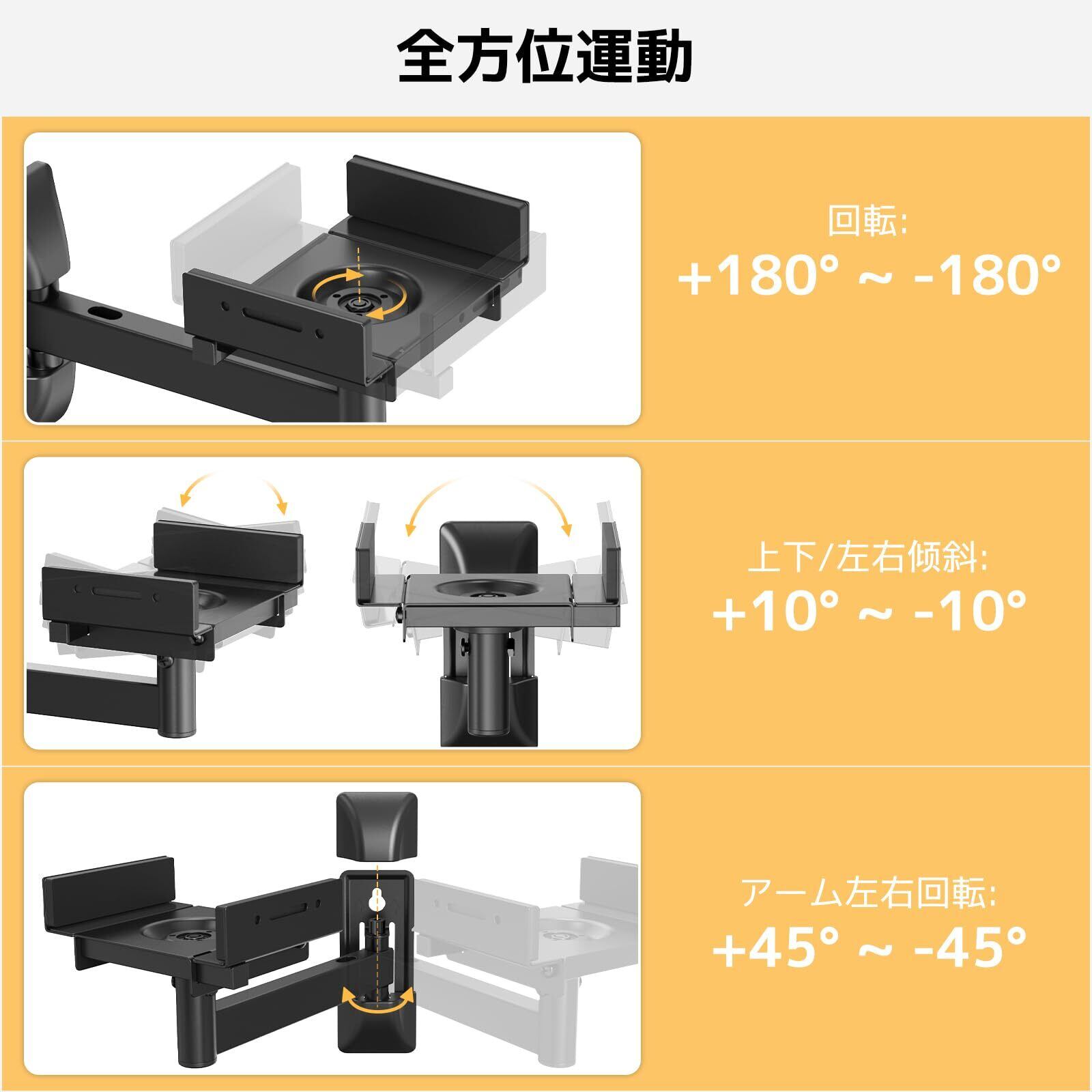 【全方位運動】他のスピーカースタンドに比べ、角度調節の自由度が高く、調節範囲も広くなっています。簡単に回転して位置を特定し、最適なリスニング体験に浸りながら。上下/左右に10°傾斜し、360度回転し、接続アームは左右各45度ずつ動かすことができる。書斎、寝室、リビングルームに適している。