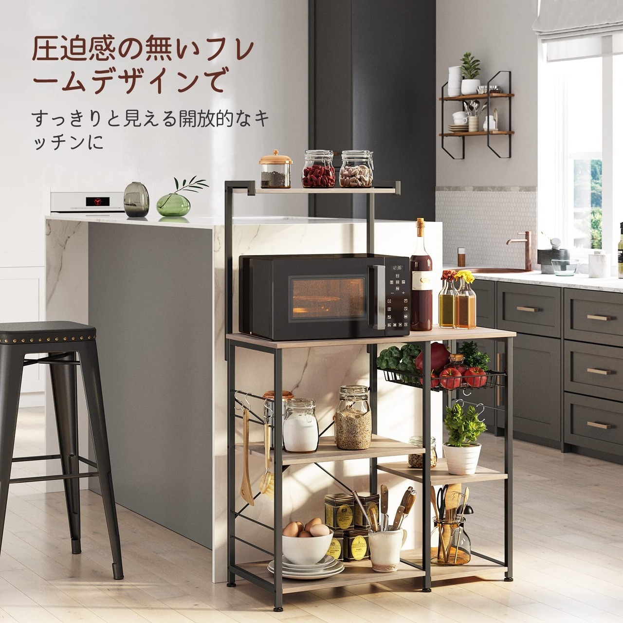 【シックなデザイン】ブラックのフレームと木目の組み合わせが落ち着いたアメリカンヴィンテージな雰囲気を演出してくれます。毎日使うキッチン用品を使いやすく、すっきりと収納