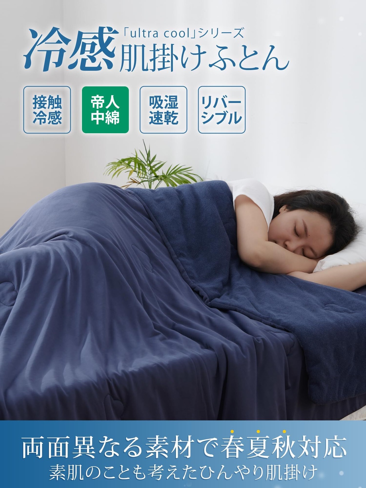 クモリ(Kumori) 夏用掛け布団 シングル 肌掛け布団 冷感&タオル地 【リバーシブル・帝人TEIJIN中わた】 掛ふとん キルトケット ひんやり 夏布団 軽量 洗える 冷房対策 夏ふとん 接触冷感 吸湿速乾 洗える かけ布団 140×190cm ネイビー