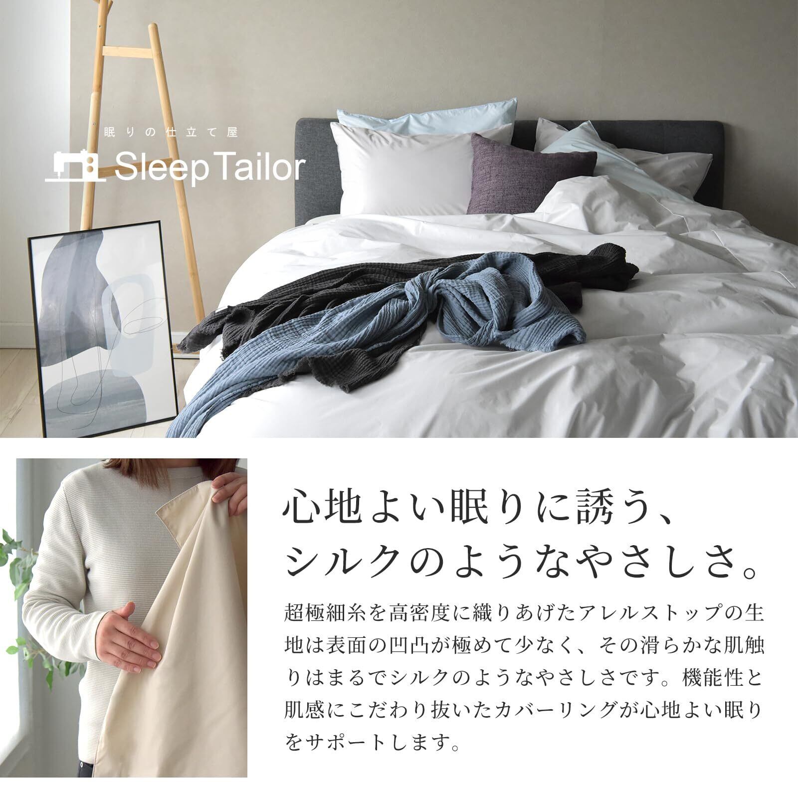 大切な身体を、薬品を使わずダニから守る「Allerstop/d・cut」は、アトピー・アレルギーの方におすすめです。使用生地は、超極細繊維を高密度に織り上げており、ダニやほこり(ハウスダスト)は入り込むことができません。また、縫製にもこだわっており、ミシン目を非常に細かくしてあります。これで、ほとんどのダニの侵入を防ぐことが出来ます。防虫剤などの薬品は一切使用していませんので、お子様やお年寄りにも安心です。生地を高密度に織り上げているため、表面の凹凸が非常に少なく、ホコリやペットの毛がつきにくく、手でサッと払えば落ちてしまうほどです。また、静電気の帯電も少ないので、乾燥した季節でも安心して布団に入ることができます。 ポリエステル80%、綿20%。コットンを適量混合する事により吸湿面をカバーすることで、機能面と吸湿性に優れ、使用感の気持ちの良いカバーになりました。
