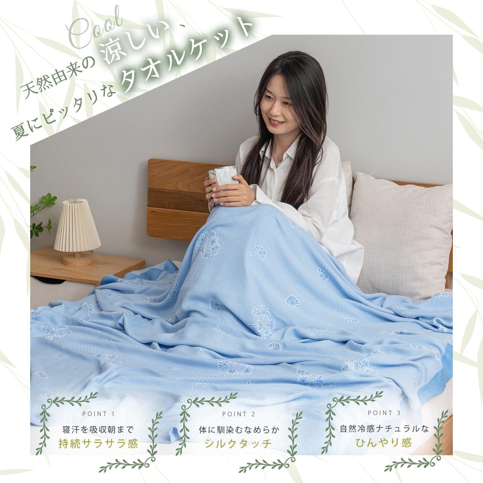【さらさら感たっぷり、心地よい眠り】さらさらで肌触りが柔らかい、春夏も快適に眠れる特長を持つタオルケットです。摩擦が少なく、ほとんど静電気が発生しません。さらに、天然の抗菌力と消臭力を備えており、敏感肌の方や肌の弱い方にもおすすめです。