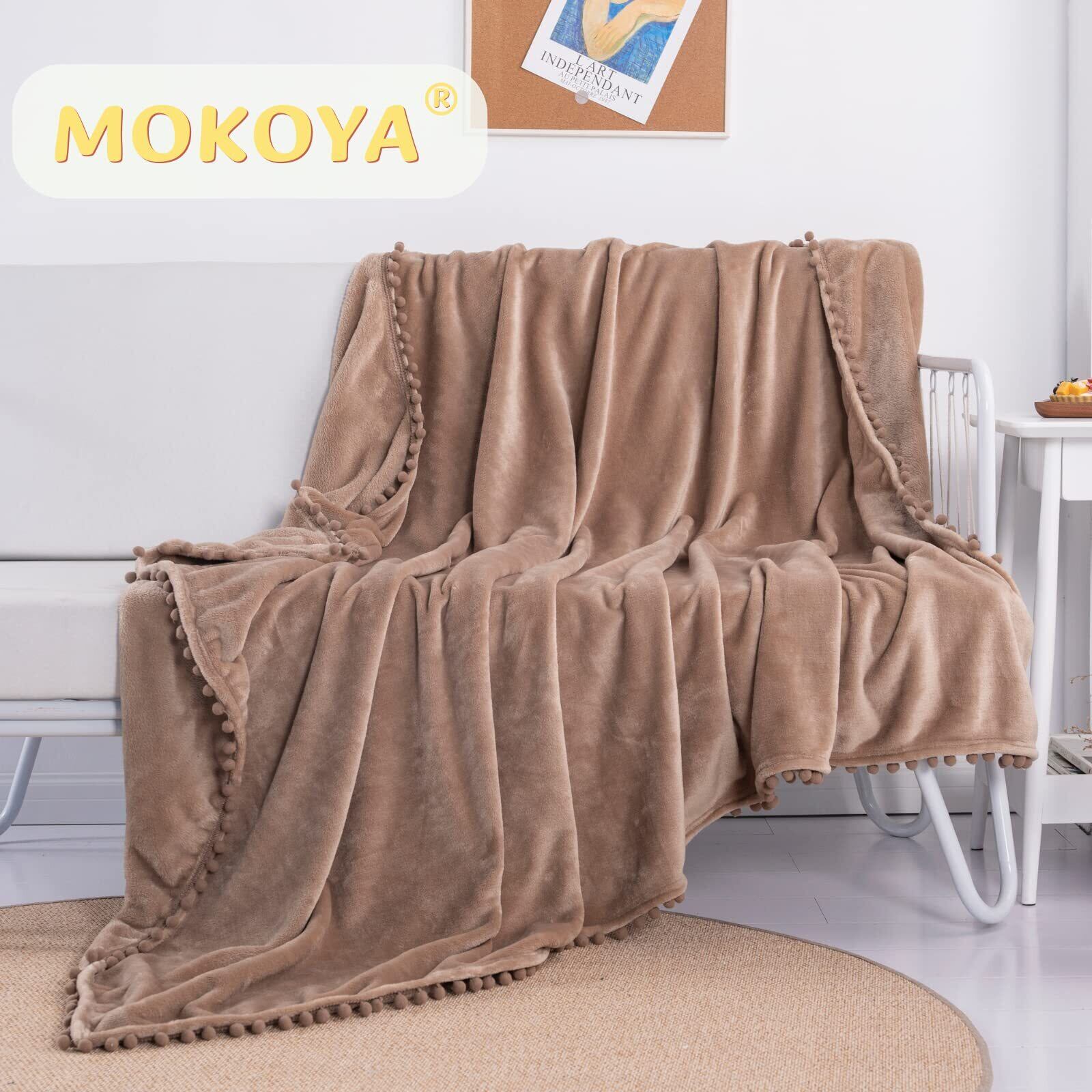 Mokoya 毛布 セミダブル 可愛い ブランケット 150x200cm かわいいポンポン付き ふわふわ柔らかい 多用途 タオルケット 軽量 洗える 通年使用(カーキ)