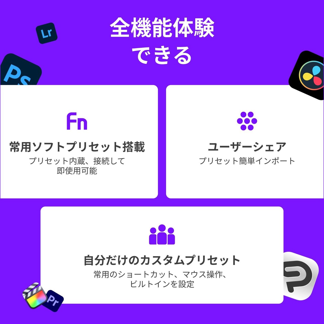 【No.1 左手デバイス】各アプリケーションに対応した、豊富なデフォルトプリセットが付属。簡潔なインターフェースと、人間工学に基づいたハードウェアで創作が今まで以上に簡単かつ快適に。クリエイティブで楽しい毎日が待っています!