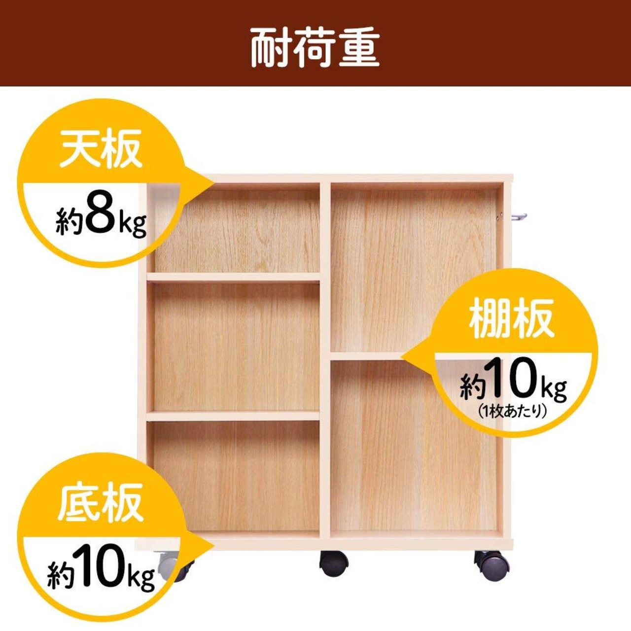 耐荷重:天板:約8kg 底板各:約10kg 棚板:1枚あたり約10kg 全体:約48kg