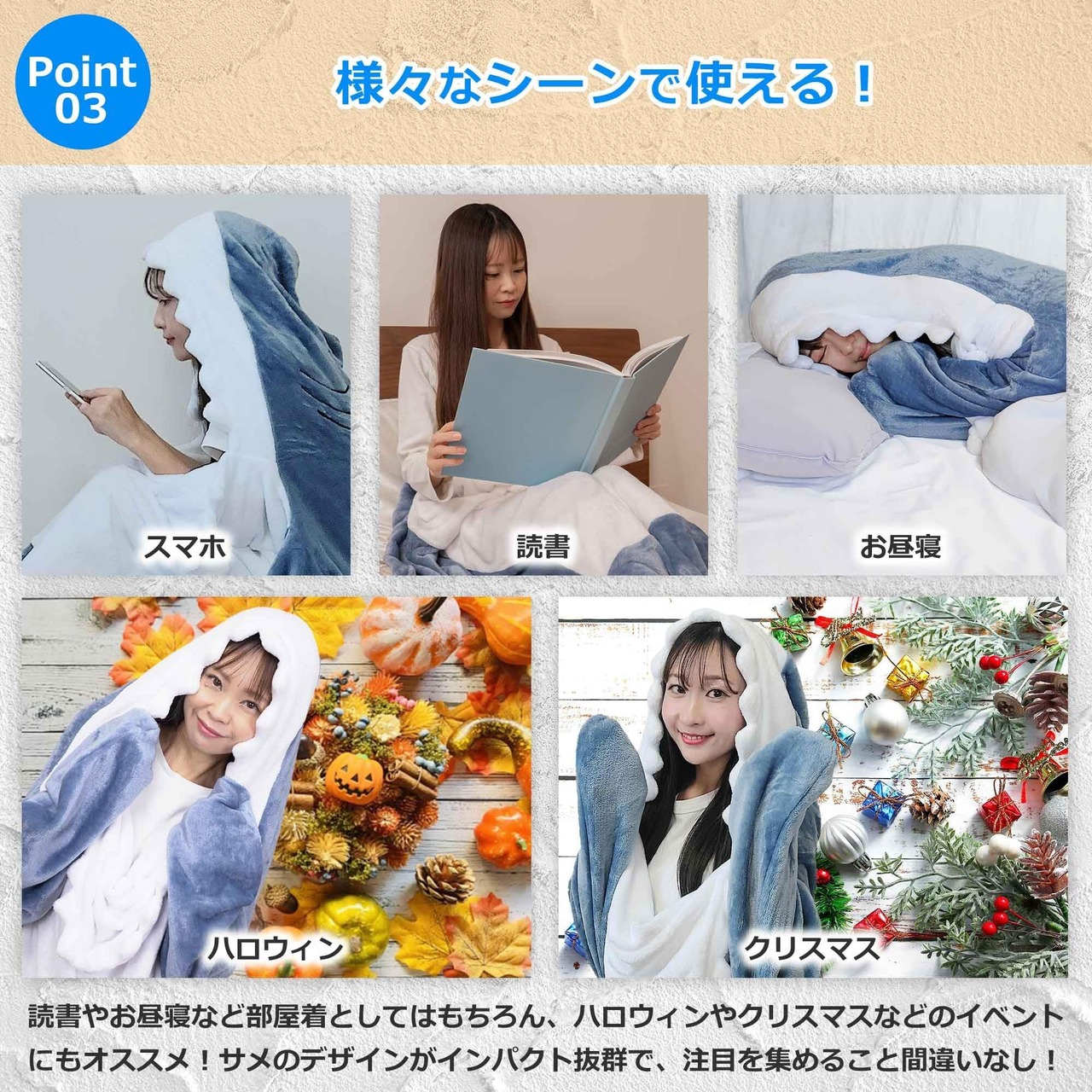 【ポイント3:様々なシーンで使える!】読書やお昼寝など部屋着としてはもちろん、ハロウィンやクリスマスなどのイベントにもオススメ!サメのデザインがインパクト抜群で、注目を集めること間違いなし!