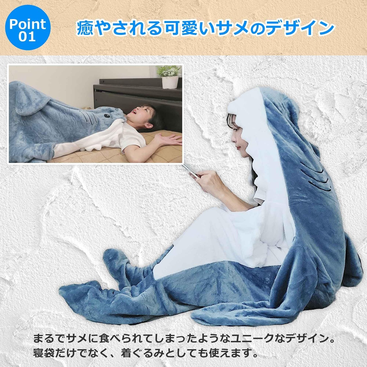 【ポイント1:癒やされる可愛いサメのデザイン】まるでサメに食べられてしまったようなユニークなデザイン。寝袋だけでなく、着ぐるみとしても使えます。