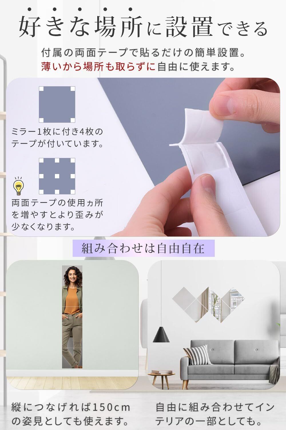 30cm×30cmのシートが5枚setでご用意、1枚ずつ使うのはもちろん、縦につなげれば150cmの姿見としても活用できます。