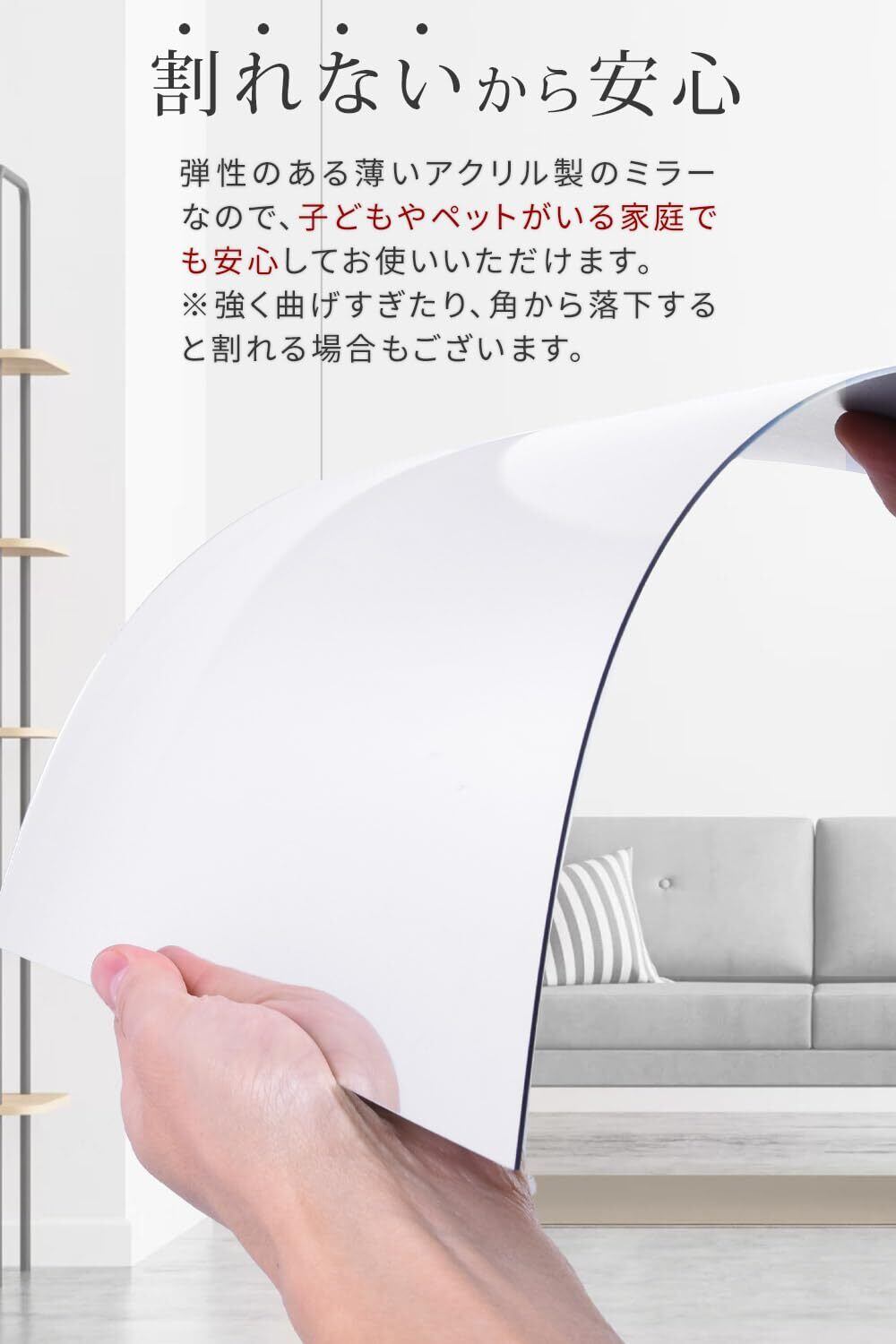 本製品は貼り付けるタイプのアクリル製ミラーです。子どもの衝突時や地震などの災害時にも割れる危険がないので、安心してご利用いただけます。