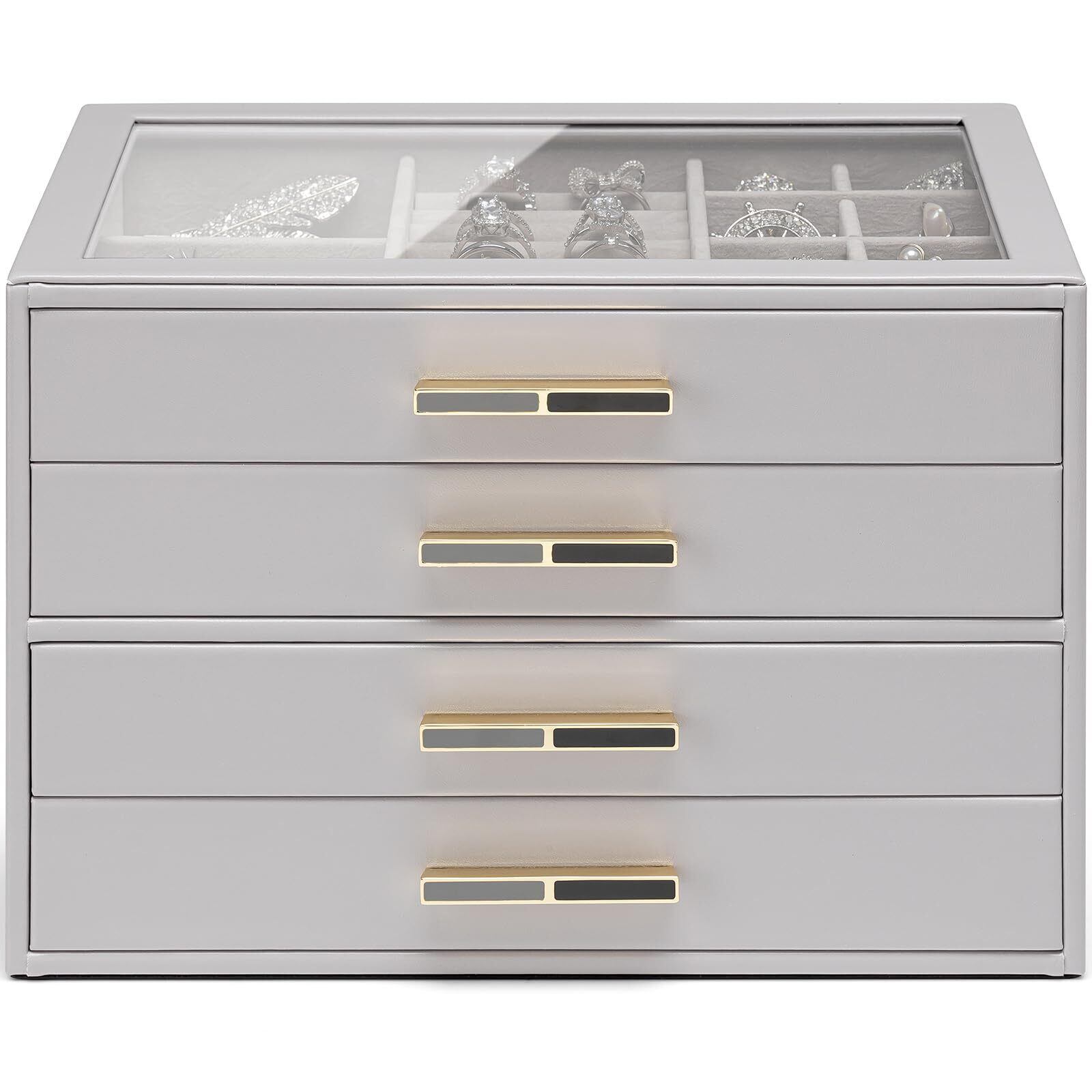 【 大きな透明な蓋 】 ガラスの蓋の下にお気に入りのジュエリーを収納して、いつでも一目で見つけられます。4層のジュエリーボックスには4つの引き出しとたくさんの仕切りがあり、金色の金具が付いています。上部と引き出しは簡単に開けられます。