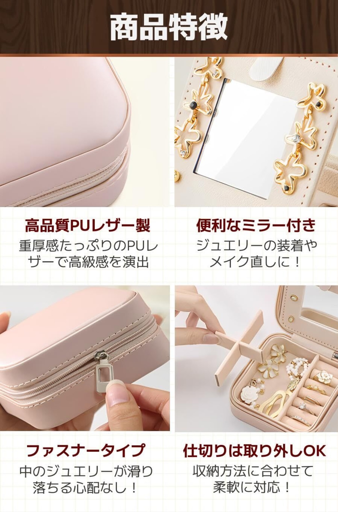【商品特徴】①高品質PUレザー製:重厚感たっぷりのPUレザーで高級感を演出/②便利なミラー付き:ジュエリーの装着やメイク直しに!/③ファスナータイプ:中のジュエリーが滑り落ちる心配なし!/④仕切りは取り外しOK:収納方法に合わせて柔軟に対応!