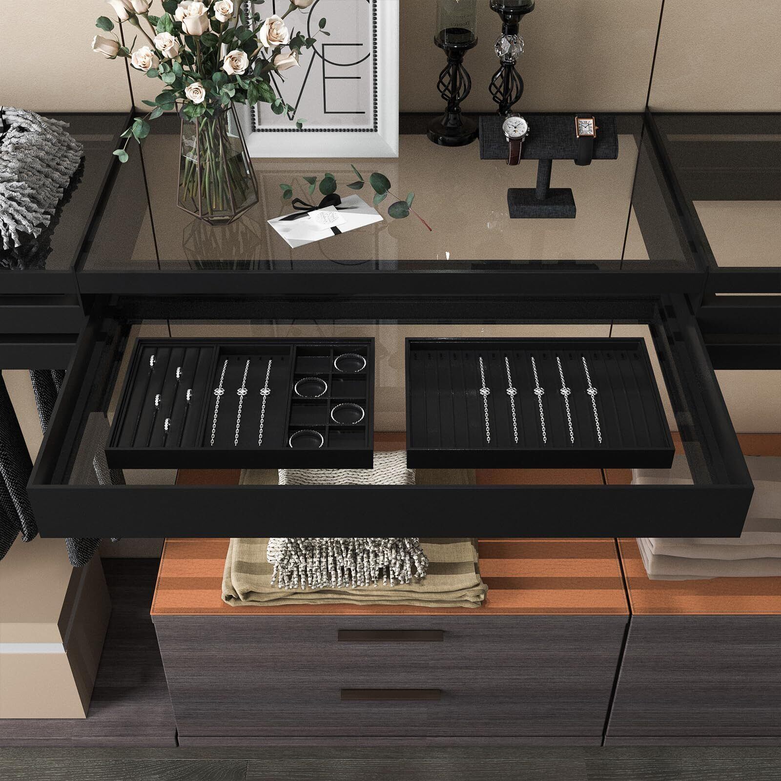 【優れたデザイン】仕切りが無い、シンプルなフラットトレイです。このアクセサリー収納トレーは引き出しやドレッサーに積み重ねてスペースを節約し、増え続けるコレクションに対応できます。