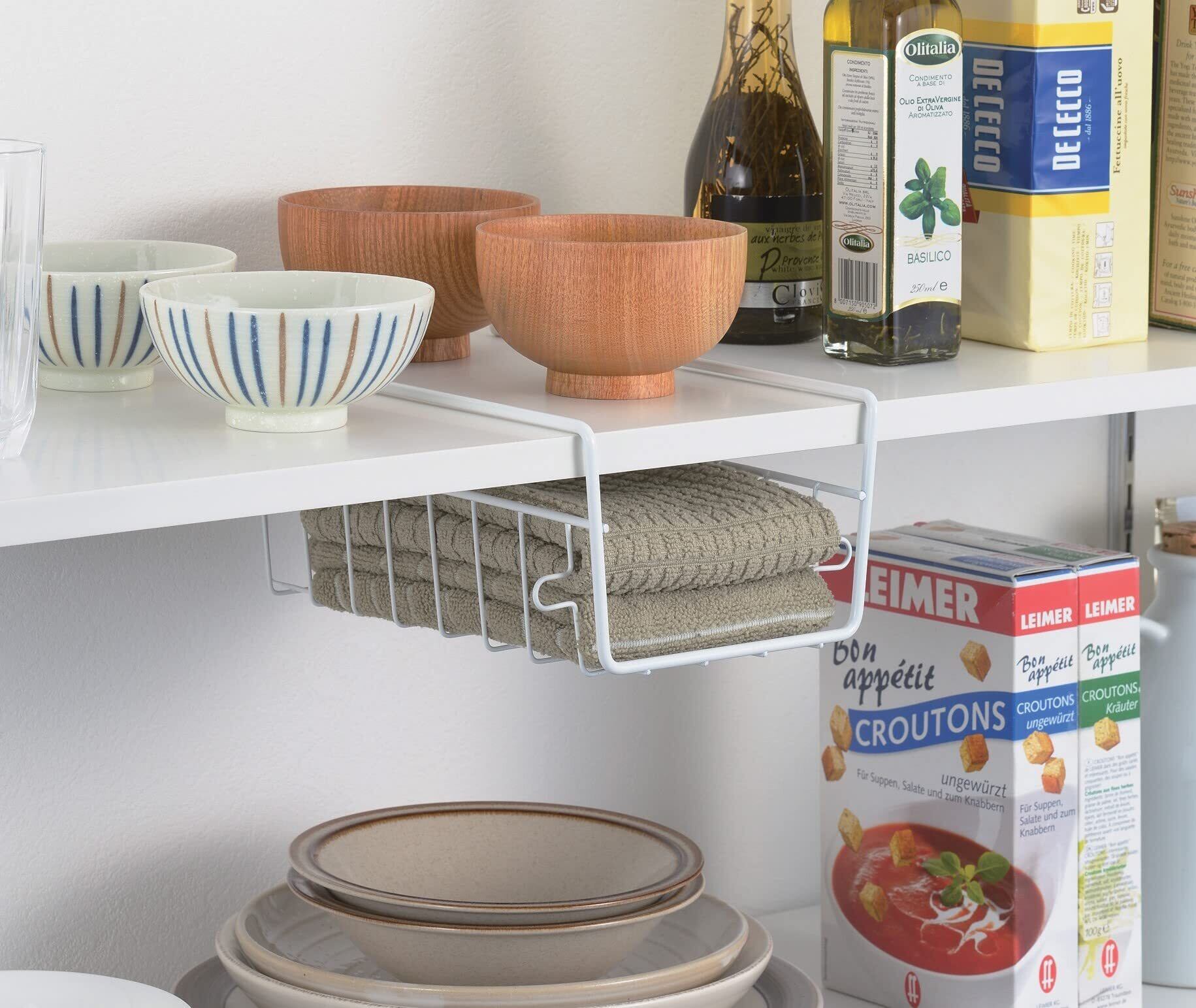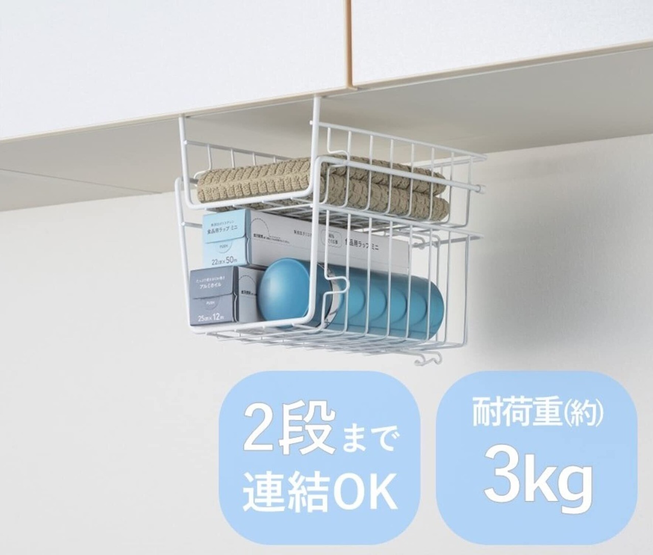 吊り戸棚の下を有効活用吊り下げ戸棚の棚板に差し込むだけで簡単に取り付けられます。
