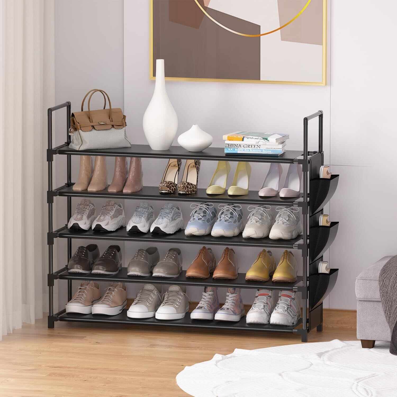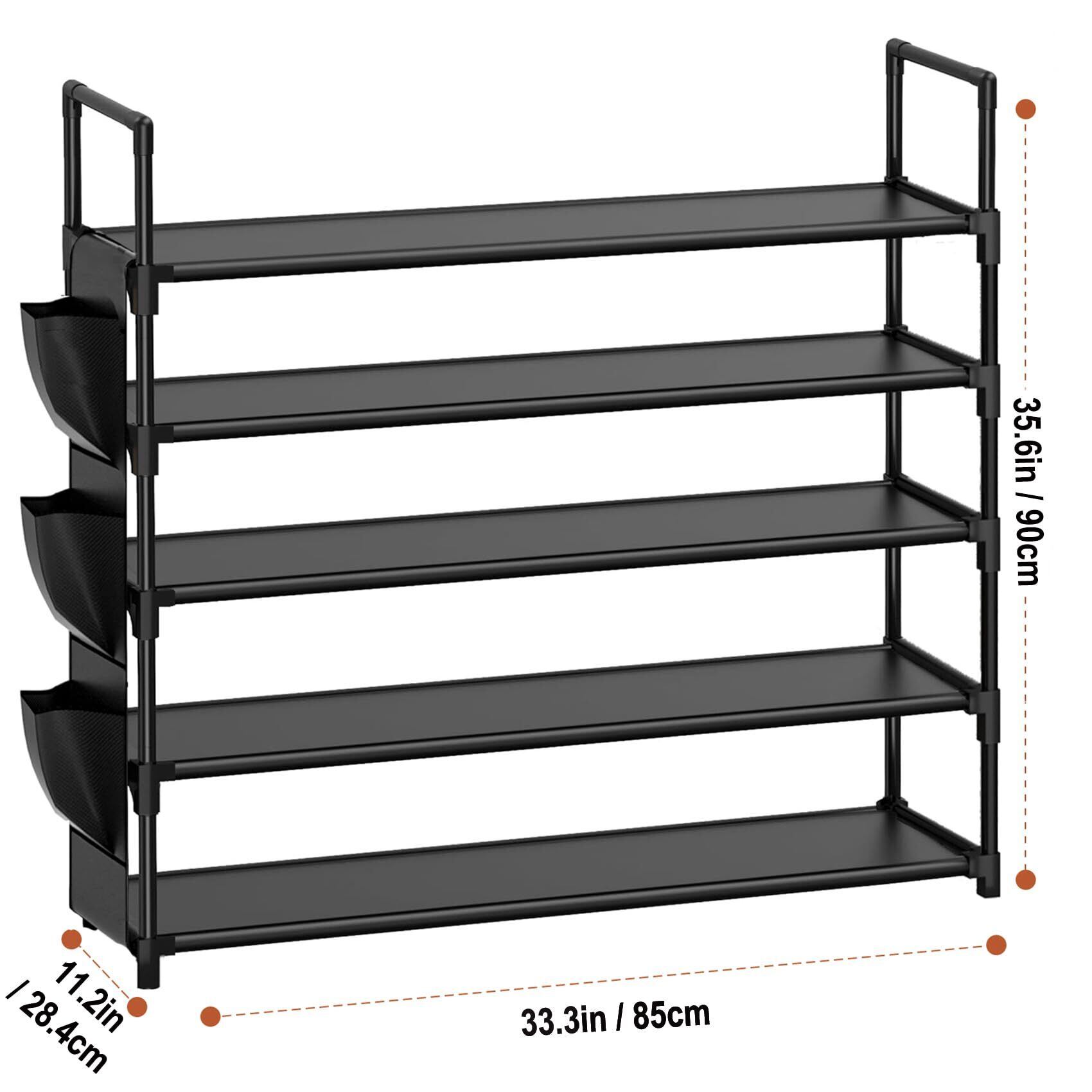 大容量ロングシューズラック:この 5 段階ブラックシューズラックにはサイドポケット付きで豊富な収納スペースを備えており、幅 84.5 x 奥行き 28.4 x 高さ 90.4cm (33.3 x 11.2 x 35.6インチ)のサイズで、20~25 足の靴を収納可能です。各棚に 4~5 足の靴を収納できる、エントランスに最適な靴収納オーガナイザーです。