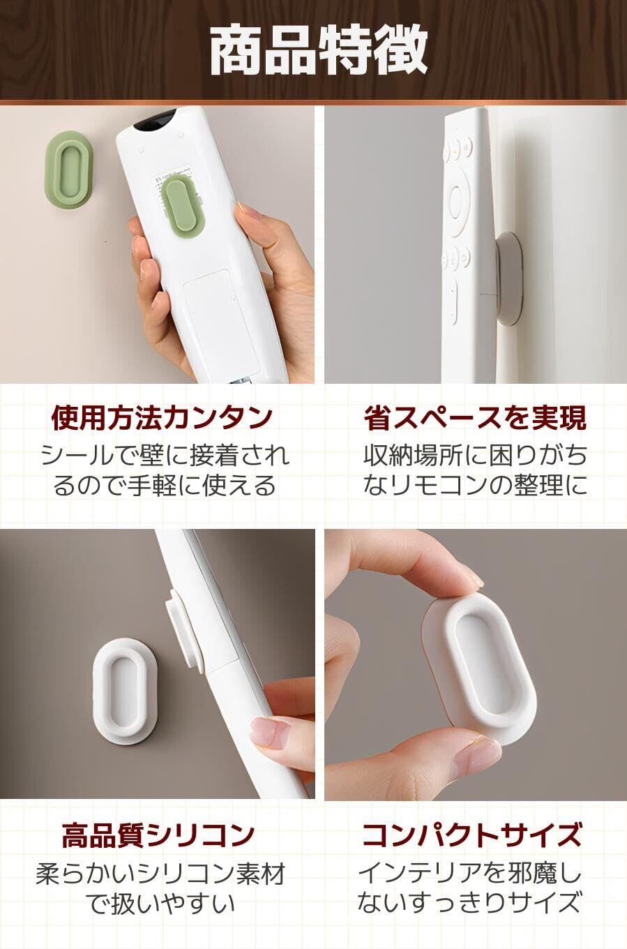 【商品特徴】①使用方法カンタン:シールで壁に接着されるので手軽に使える/②省スペースを実現:収納場所に困りがちなリモコンの整理に/③高品質シリコン:柔らかいシリコン素材で扱いやすい/④コンパクトサイズ:インテリアを邪魔しないすっきりサイズ